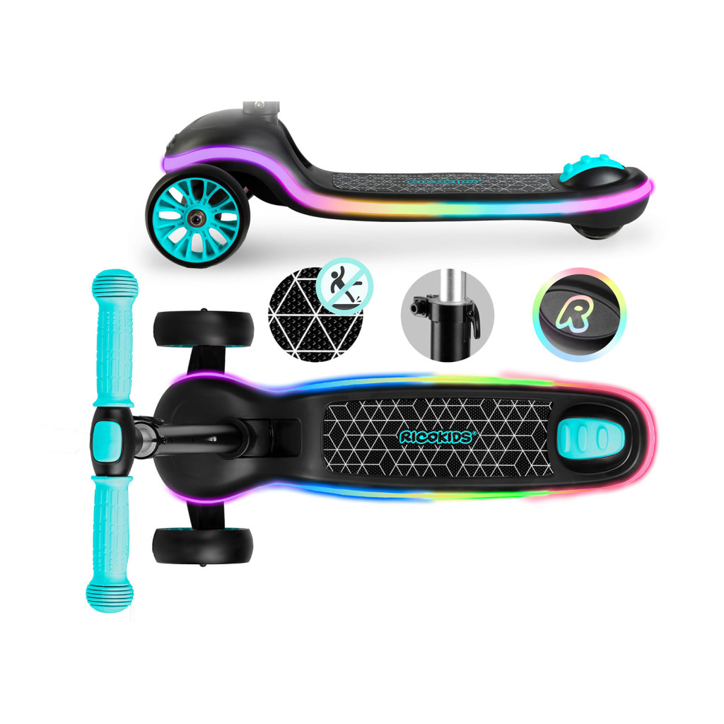 Indítsd be a mindennapi kalandot a Ricokids Leddi háromkerekű LED-es gyerekrollerrel! A mindössze 4,3 kg-os vázat a lurkók könnyedén mozgatják, a döntéssel kormányzható első tengely pedig segíti az egyensúly fejlesztését. A fellépő oldalán végigfutó, színváltó fénycsík és a kerekekbe épített diódák látványos fényjátékot teremtenek, így a gyerek mindig jól látható. A csúszásmentes taposófelület, a stabil háromkerekű kialakítás és a puha, türkiz markolatok gondoskodnak a biztonságos gurulásról.