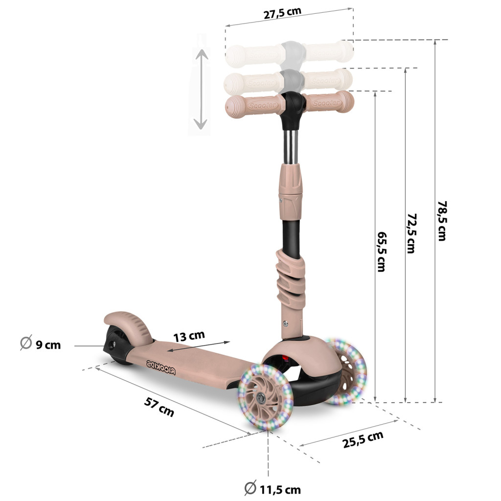 A Ricokids Todi 3 az 1-ben háromkerekű roller – bézs színben – ideális társ a kis kalandoroknak 2–6 éves korig. A könnyű, mindössze 3,3 kg-os váz három állásban emelhető ülést, leszerelhető tolókart és 3 fokozatban állítható kormányt rejt, így a járgány együtt nő a gyermekkel. A széles, csúszásgátló fellépő és a stabil, két elöl, egy hátul elrendezésű kerekek biztonságos egyensúlyozást tesznek lehetővé, miközben a LED-fényes első kerekek vidám, színes ragyogással dobják fel a gurulást – akár 30 kg terhelésig.