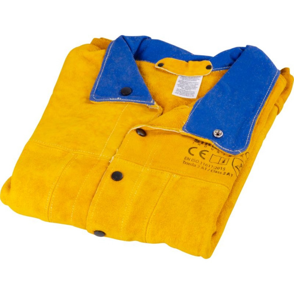 Ez a kabát második osztályú minősítésével ideális erős fröccsenéssel járó MMA, MAG vagy MIG hegesztéshez és plazmavágáshoz. A vastag bőr kiváló hőszigetelő, miközben ellenáll a lángnak és az olvadt fémnek. A kontrasztos kék gallér védi a nyakat, ugyanakkor stílusos megjelenést kölcsönöz. A patentos rögzítés megakadályozza a fémgombok túlmelegedését, a laza szabás pedig lehetővé teszi az aláöltözést hideg műhelyben is.