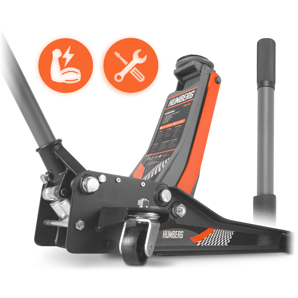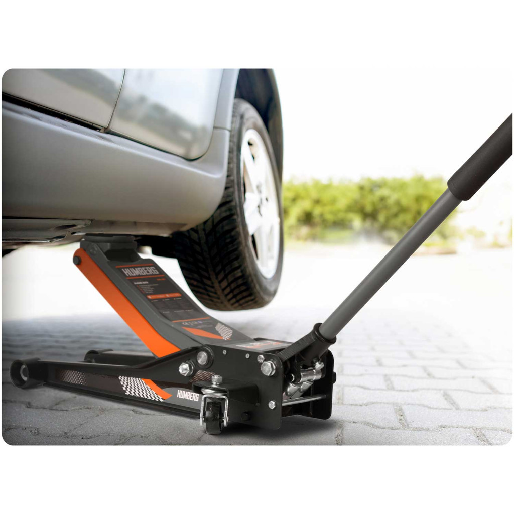 Emeld fel biztonságosan még a sportosan ültetett autódat is a Humberg HM-381 3 tonnás, alacsony profilú hidraulikus emelővel! A mindössze 75 mm-es induló magasság könnyedén becsúszik a küszöb alá, a 505 mm-es végállás pedig bőséges helyet hagy a kerékcseréhez vagy az alvázmunkákhoz. A kétdugattyús hidraulikarendszer gyors és erőlködésmentes pumpálást biztosít, miközben a széles acélváz, a tömör első kerekek és a 360°-ban forgó, csapágyazott hátsó görgők stabil tartást és pontos manőverezést garantálnak, akár 3 000 kg-ig.