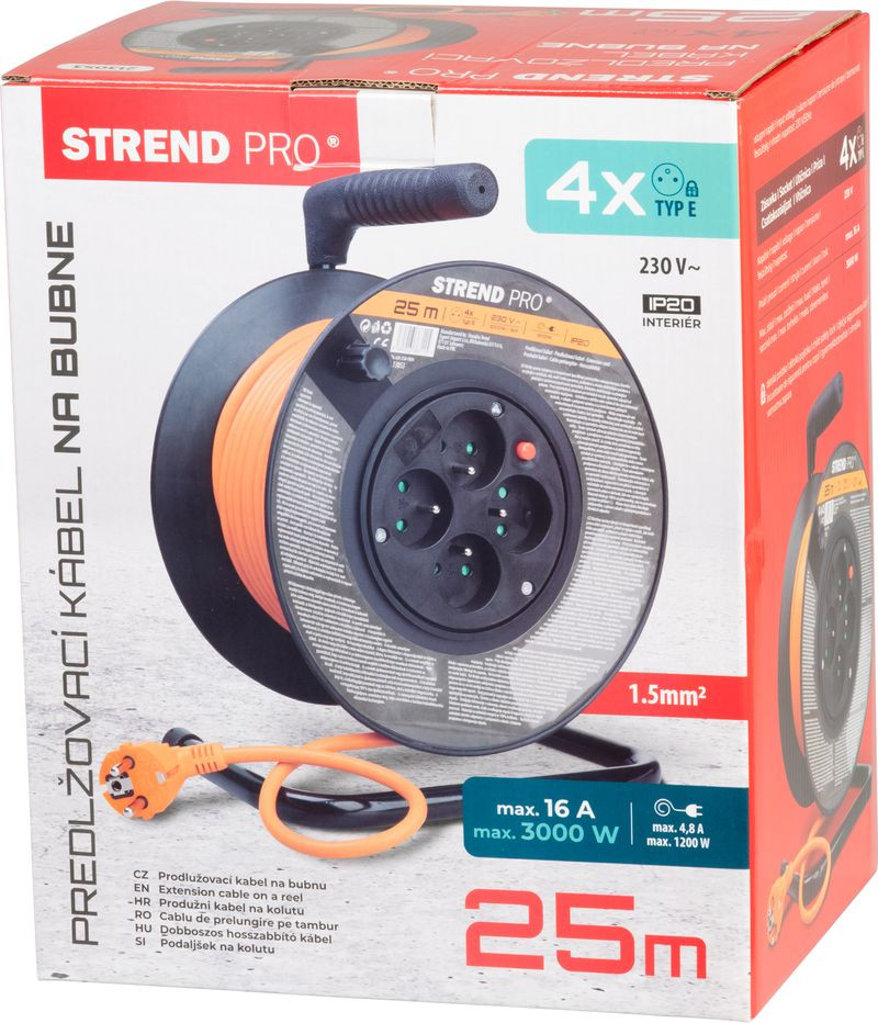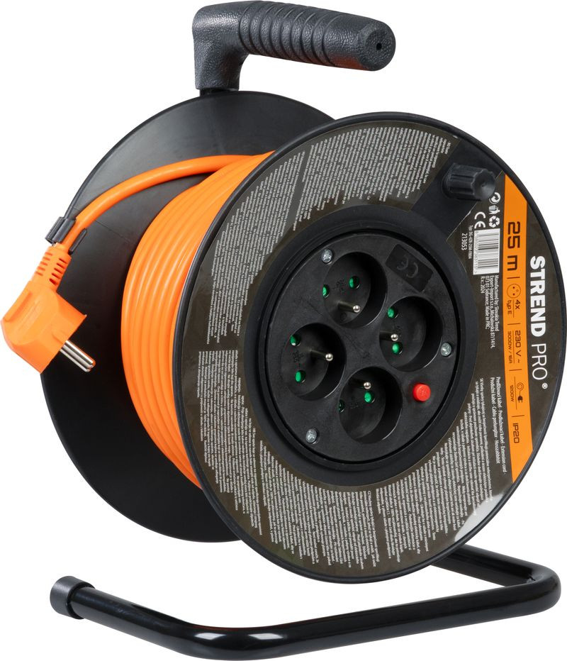 A Strend Pro DG-FB04 dobon lévő hosszabbítóval többé nem akadály a távolság! A 25 méter hosszú, 1,5 mm² keresztmetszetű, narancssárga hálózati kábel biztonságosan vezeti az áramot akár 3680 W teljesítményig, ha teljesen ki van tekerve. A masszív, fekete acélállvány stabil tartást, a gumírozott fogantyú könnyű hordozhatóságot biztosít. Négy földelt aljzatával egyszerre több gép vagy kerti eszköz működtethető – ideális otthoni, műhely- vagy kerti feladatokhoz.