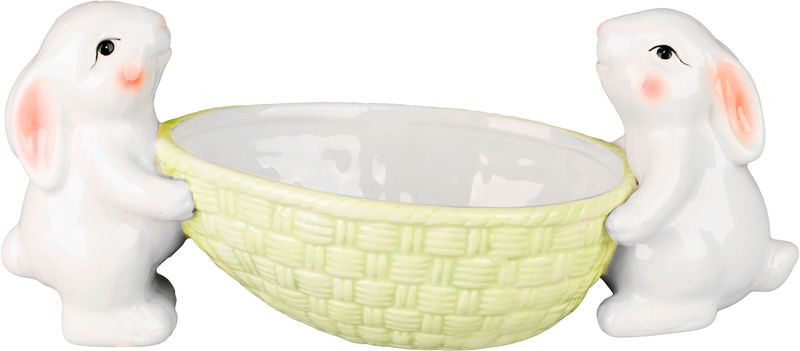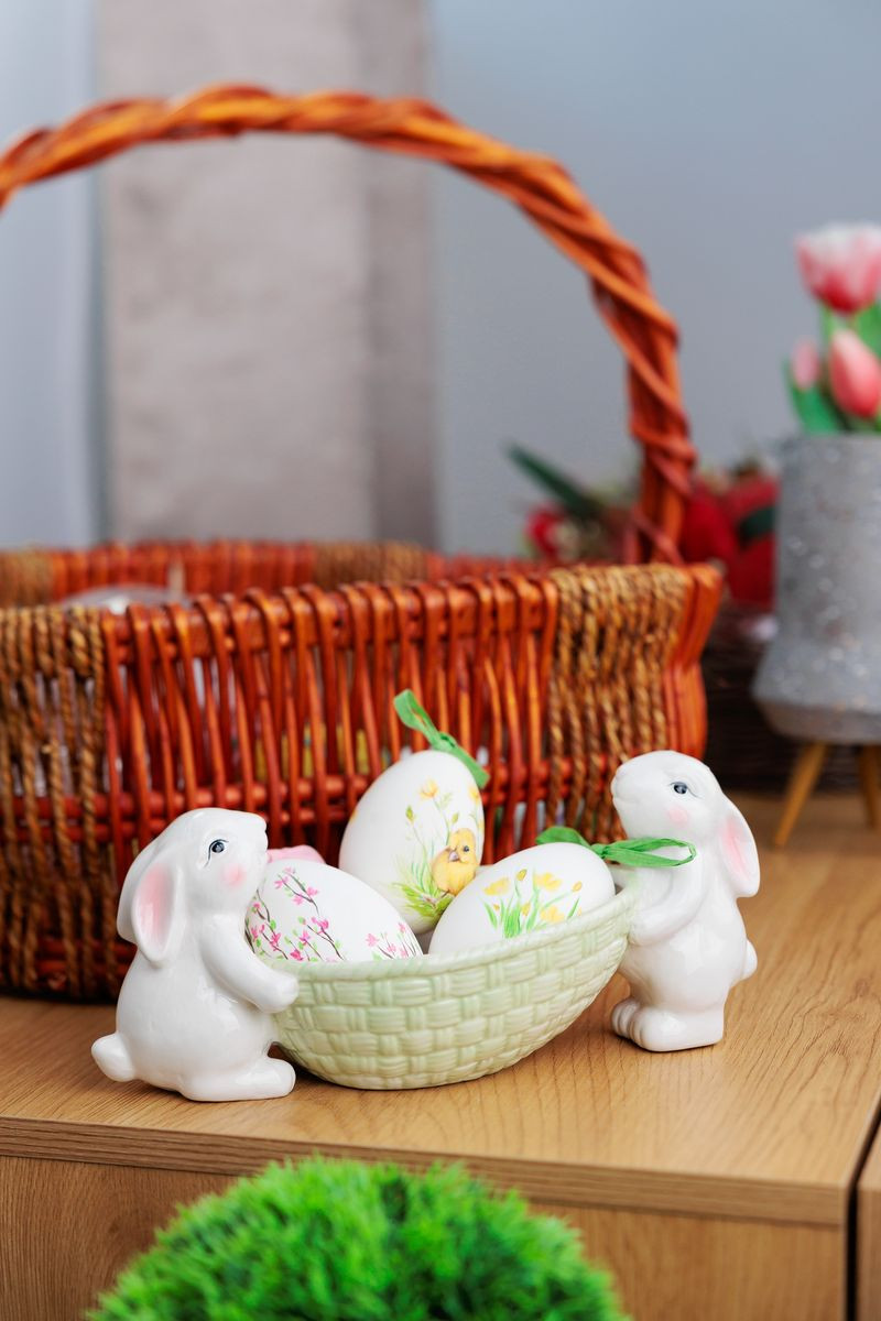 Ez a dekoráció nemcsak mutatós, hanem praktikus is: a tágas tálban akár hat–nyolc tojás is elfér, de csokoládéval töltve is remekül fest. A masszív kerámia stabil tartást biztosít, a sima máz pedig megkönnyíti a tisztítást. A kedves nyuszipár mosolyt csal a vendégeid arcára, biztonságos kialakítása miatt gyerekek mellett is gond nélkül használhatod. Semleges színei bármely terítékkel harmonizálnak, így pillanatok alatt ünnepi hangulatot teremthetsz.