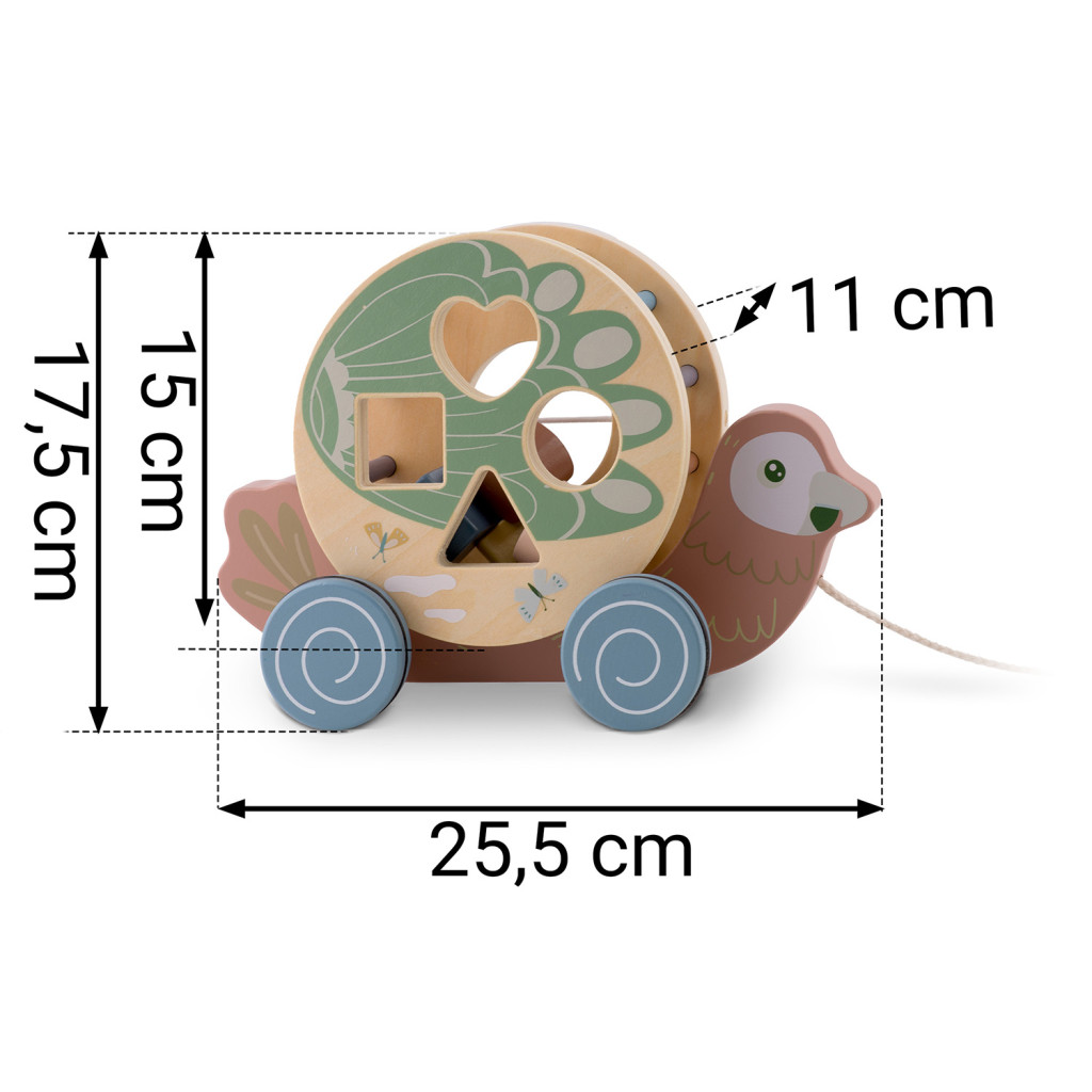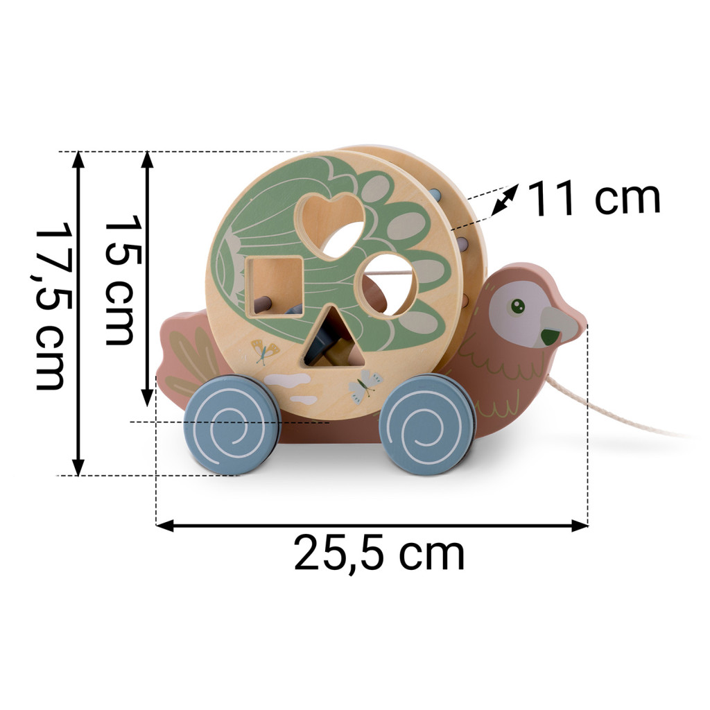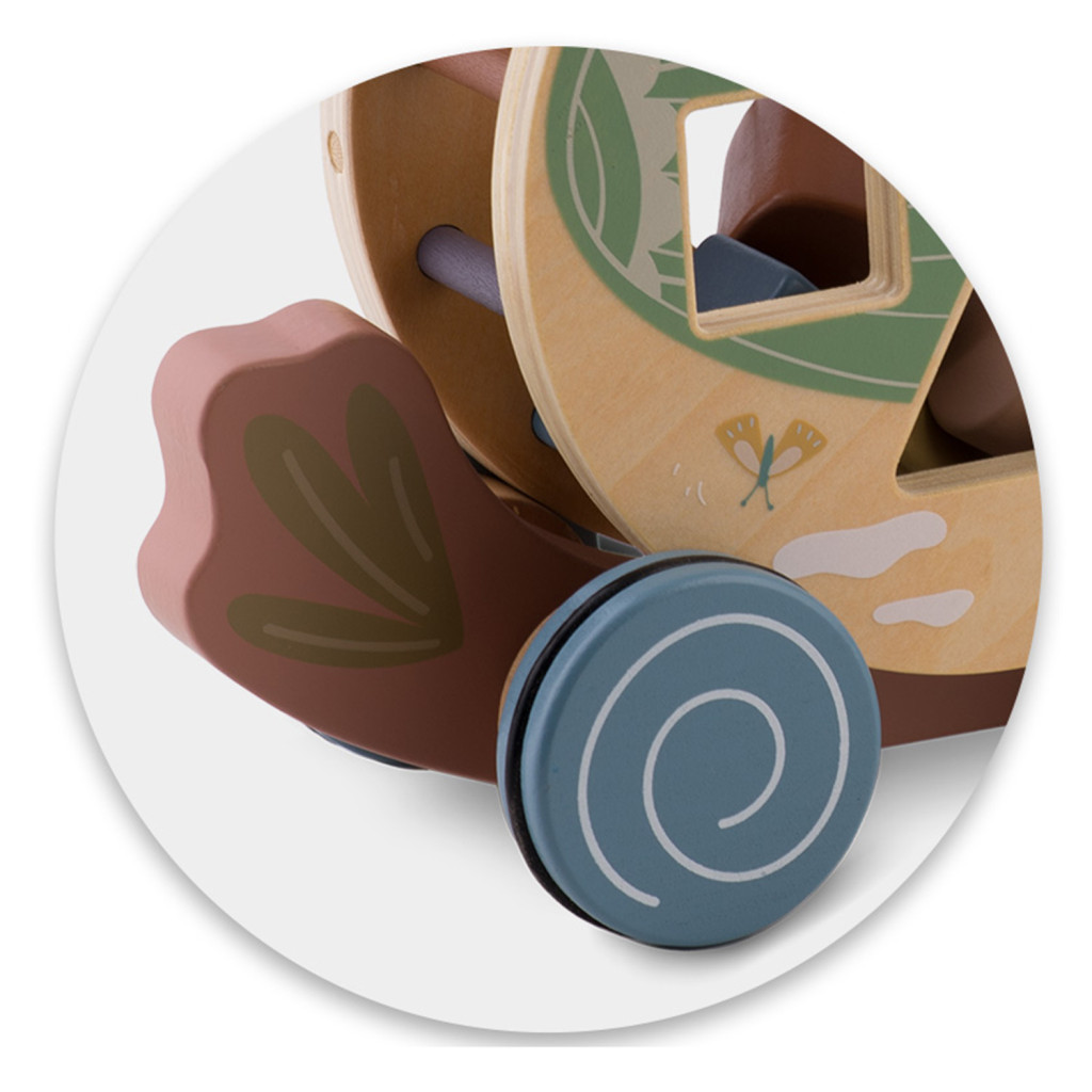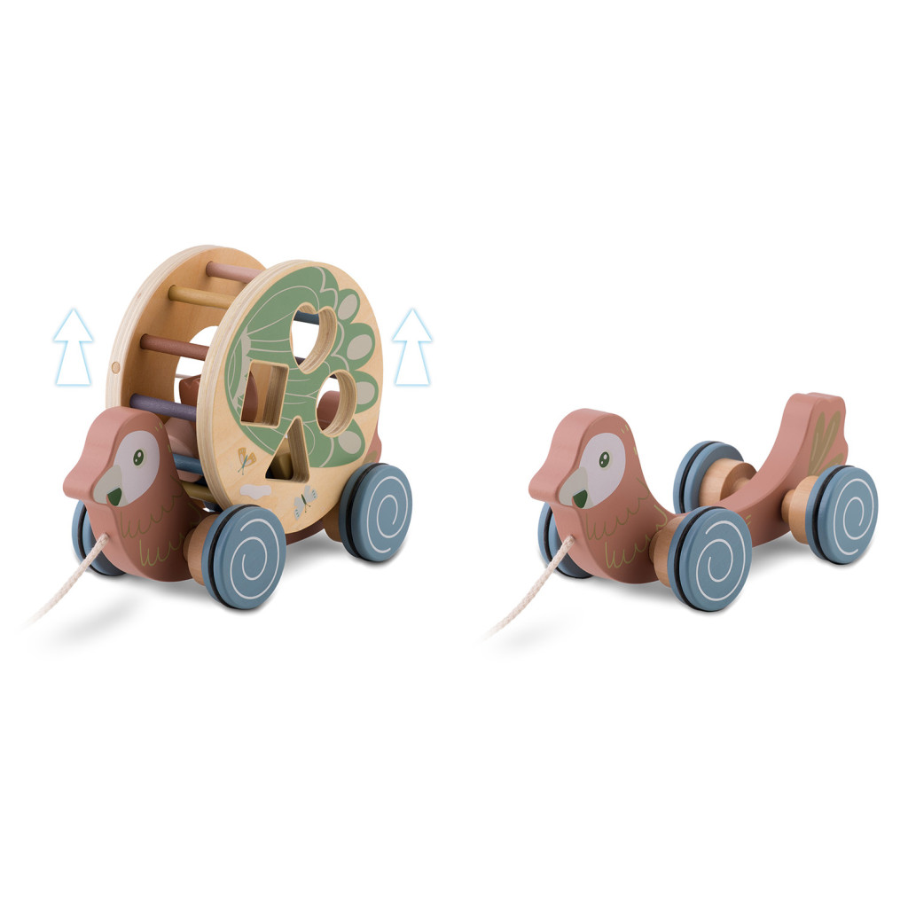 Ez a 2 az 1-ben konstrukció egyszerre fejleszti a járást és a finommotorikát. A húzó mozdulat erősíti a láb- és törzsizmokat, a forgó formaválogató pedig szem-kéz koordinációt, alak- és színfelismerést ösztönöz. A henger leemelhető, így önálló formabedobóként is használható, míg a papagáj külön guruló járműként szolgál. A tartós, natúr fa szerkezet és az EN71 tanúsítvány hosszú távú, biztonságos játékélményt garantál.