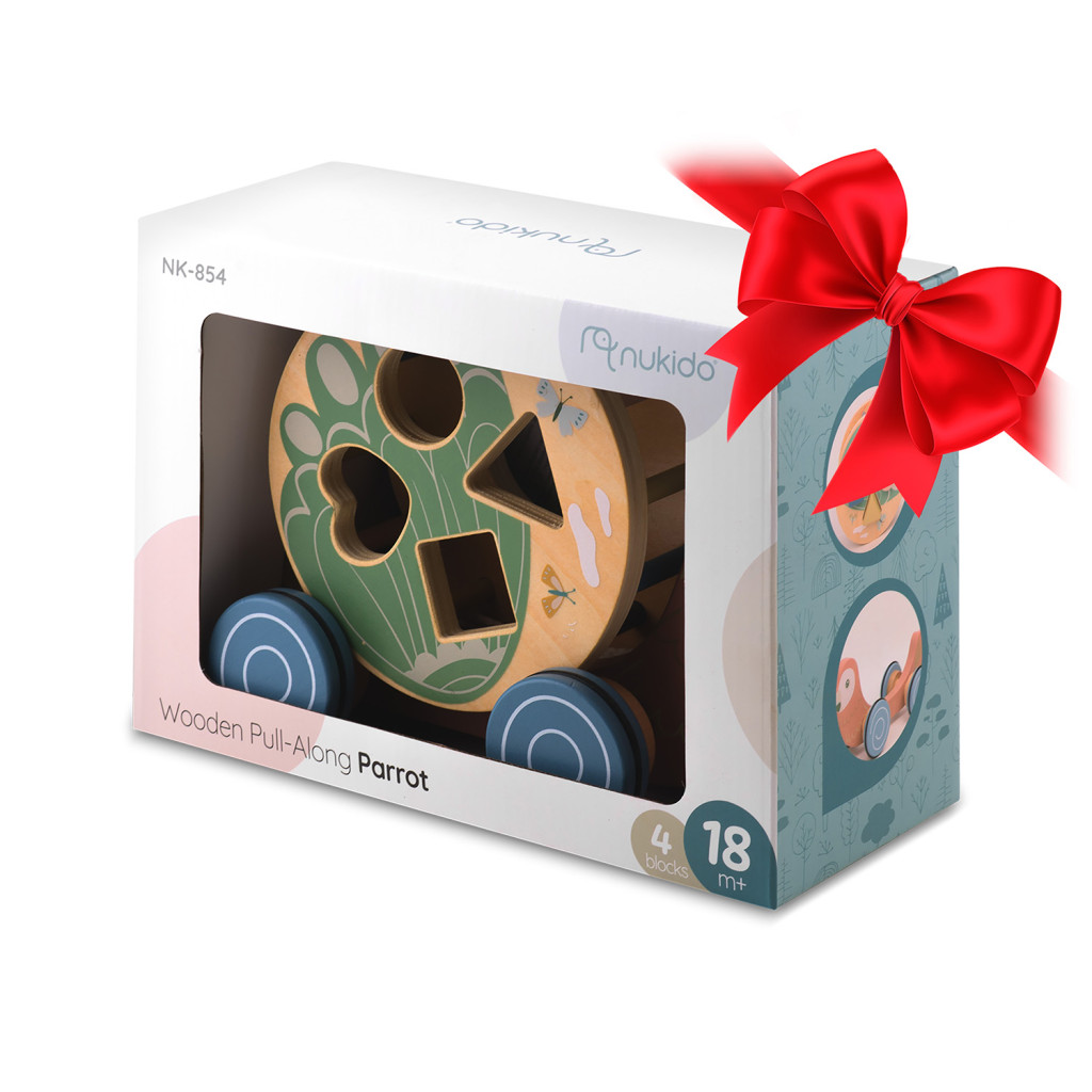 Keltsd életre gyermeked fantáziáját a Nukido NK-854 húzható Papagáj fajátékkal! A masszív, természetes fából készült kis barát a totyogós korszak ideális kísérője: ahogy a kicsi a pamutzsinórral húzza, a puha gumiperemes kerekek gördülnek, a hátán lévő hengersorter pedig vidáman forog, csörgő hanggal jelezve a mozgást. Pasztell zöld, mályva és tengerkék árnyalatai modern, letisztult megjelenést kölcsönöznek, miközben a vízbázisú festékek gondoskodnak a biztonságos játékról.