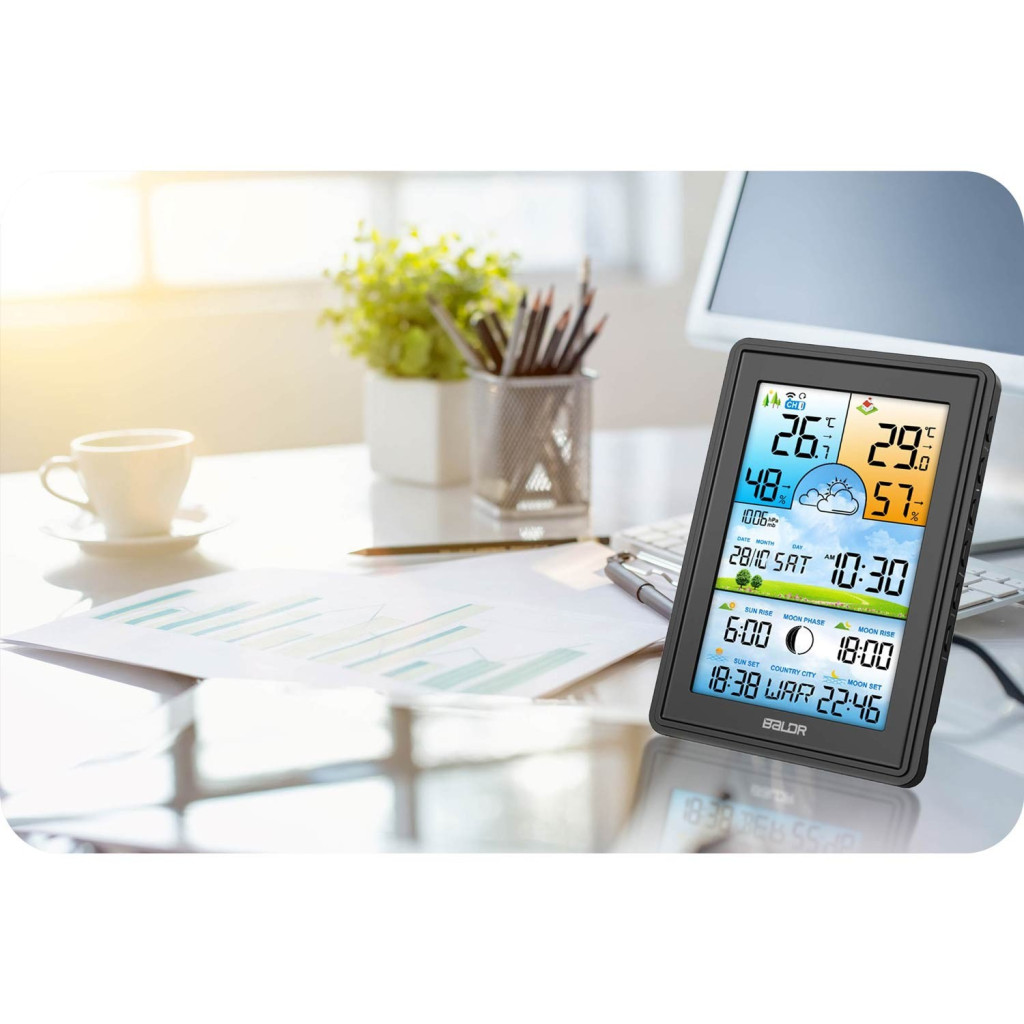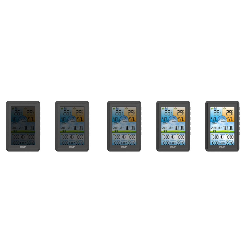 A BD-906 fekete, színes kijelzős időjárás állomás naprakész információkkal lát el: valós idejű hőmérsékletet, páratartalmat és légnyomást mér, valamint 12–24 órára előre jelzi az időjárást. A 60 m hatótávú vezeték nélküli külső szenzor folyamatosan továbbítja az adatokat, míg a négylépcsős háttérvilágítású LCD panel nappal és éjjel is könnyedén olvasható. Letisztult, elegáns formája harmonikusan illik bármely helyiségbe.