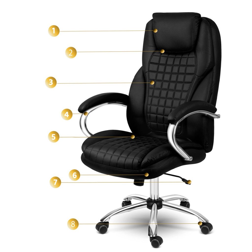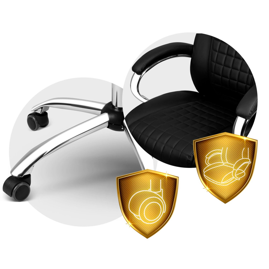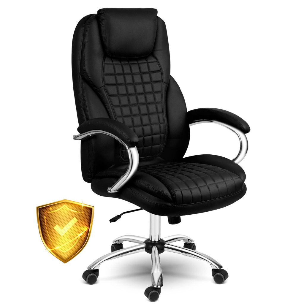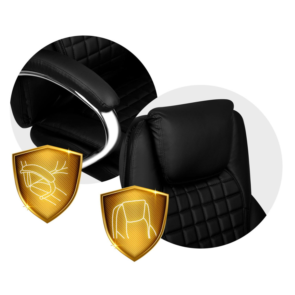 Élvezd a prémium kényelmet a Sofotel Batory irodai fotellel! A vastag, rugalmas habbal bélelt ülőfelület, a steppelt fekete ökobőr kárpit és a 77 cm magas, integrált fejpárnával ellátott háttámla együttese órákon át optimális tartást és pihentető ülést kínál. A krómozott, ötágú talp nylon–kaucsuk kerekekkel halkan gurul, miközben 120 kg teherbírással masszív stabilitást ad. Az elegáns, ívelt kartámaszok puha borítást kaptak, hogy a karok is tehermentesüljenek.
