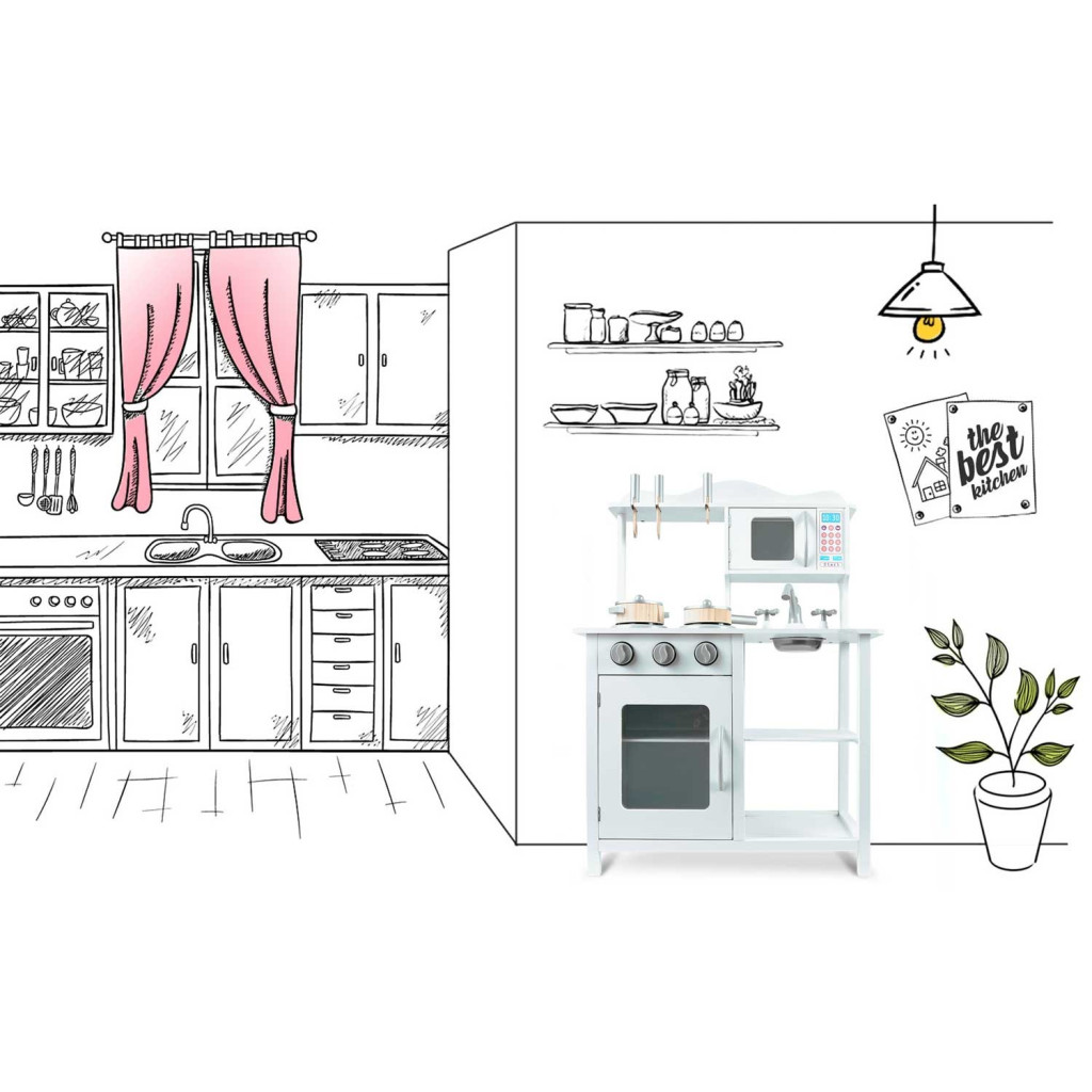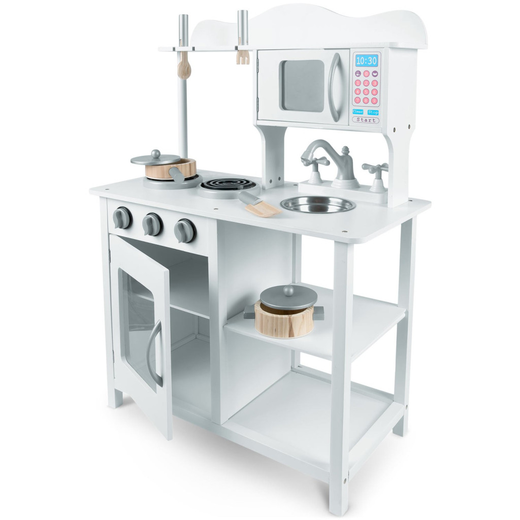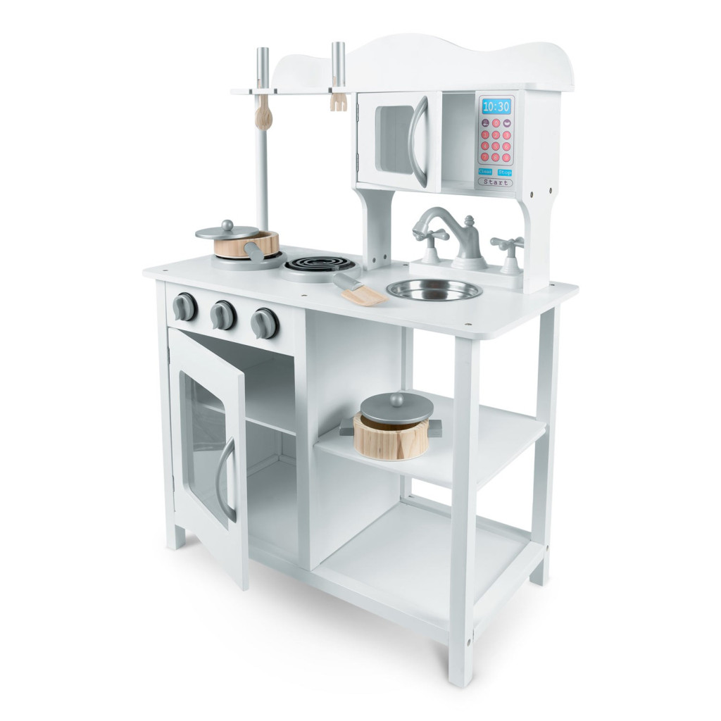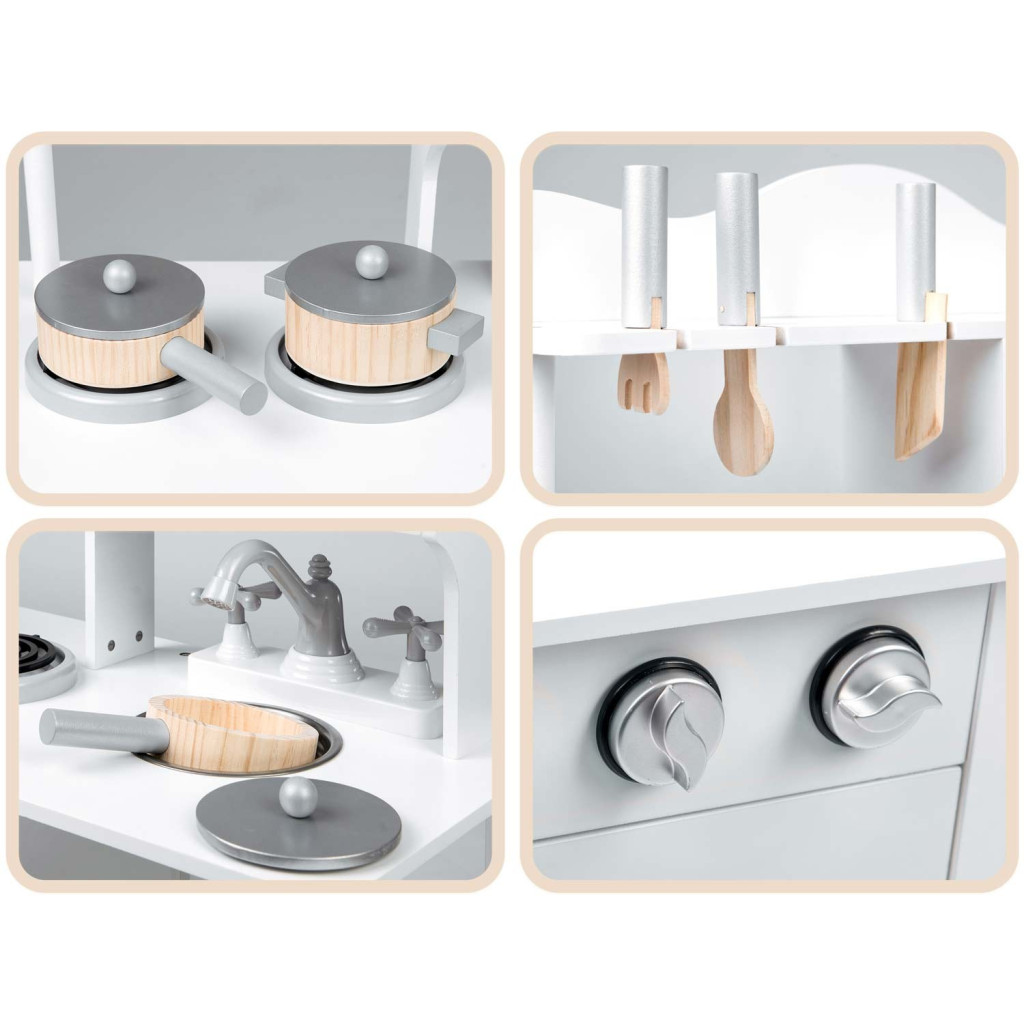 Élethű funkciói révén fejleszti a kreativitást és a finommotorikát: a kattogó gombok valódi főzést imitálnak, a levehető mosogatóban valódi vízzel is lehet mosogatni, a gazdag edény- és evőeszközkészlet pedig szerepjátékra ösztönöz. A praktikus polcok, akasztók és a stabil, tömörfa szerkezet hosszú távon is rendezett, strapabíró játszóteret biztosítanak. Az EN-tanúsítvány plusz nyugalmat ad a szülőknek.