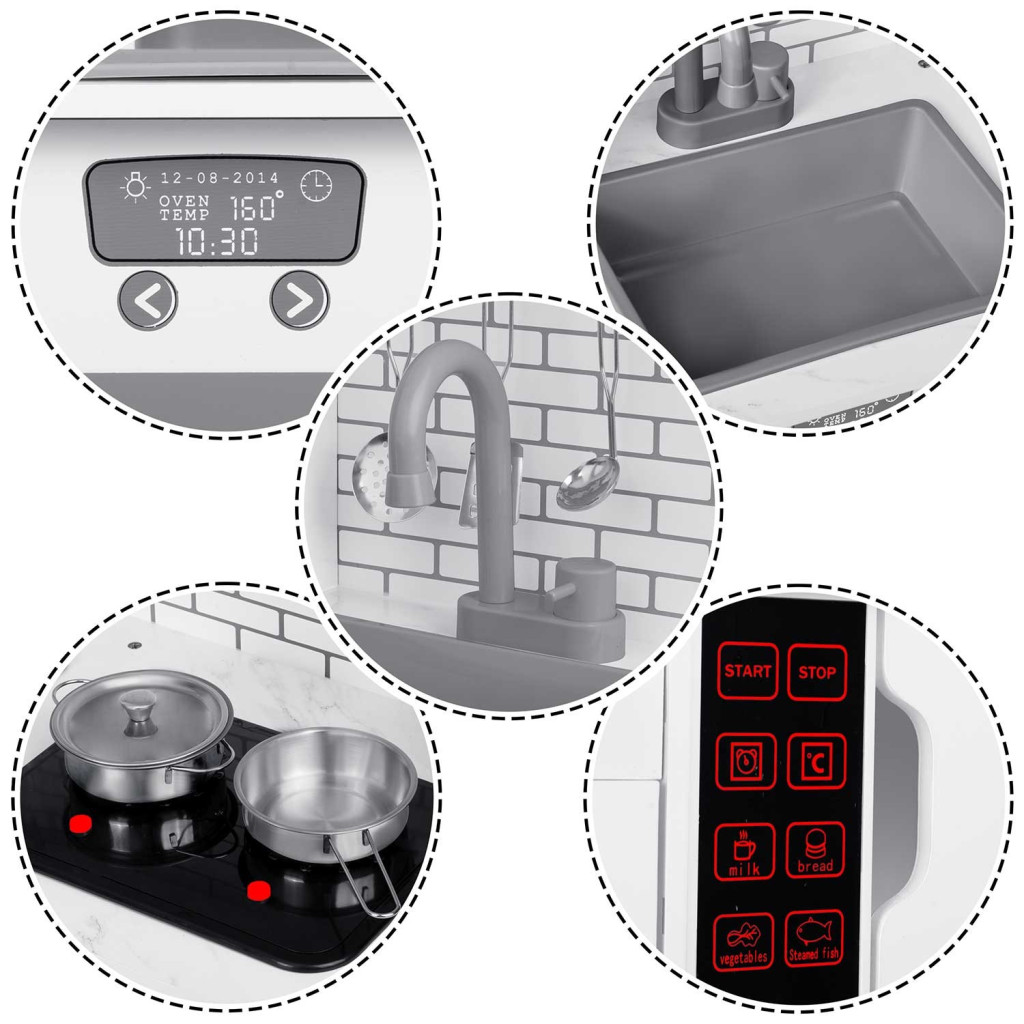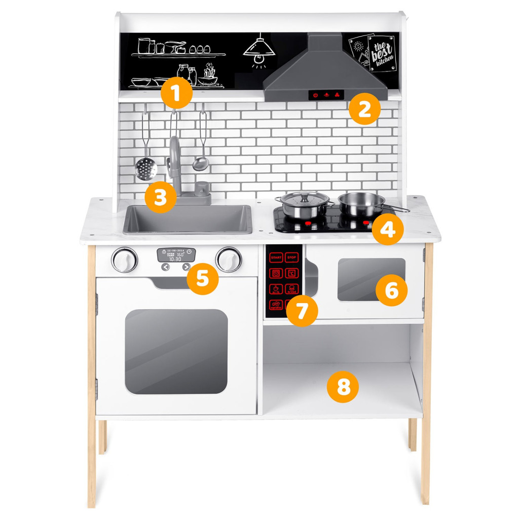 Nyisd meg a fantázia éttermét a Ricokids RC-846 fa játékkonyhával! A 95 × 70 × 29,5 cm-es, 9 kg-os, masszív fa és MDF szerkezet elegáns fehér dizájnnal és tégla mintás hátfallal bármelyik gyerekszobát feldobja. LED-del megvilágított okap, világító-hangot adó főzőlapok, nyitható sütő és mikró, valamint kivehető, vízzel is tölthető mosogató teszi ellenállhatatlanná a szerepjátékot. A retro megjelenésű konyha hosszú éveken át inspirálja a kis szakácsokat.