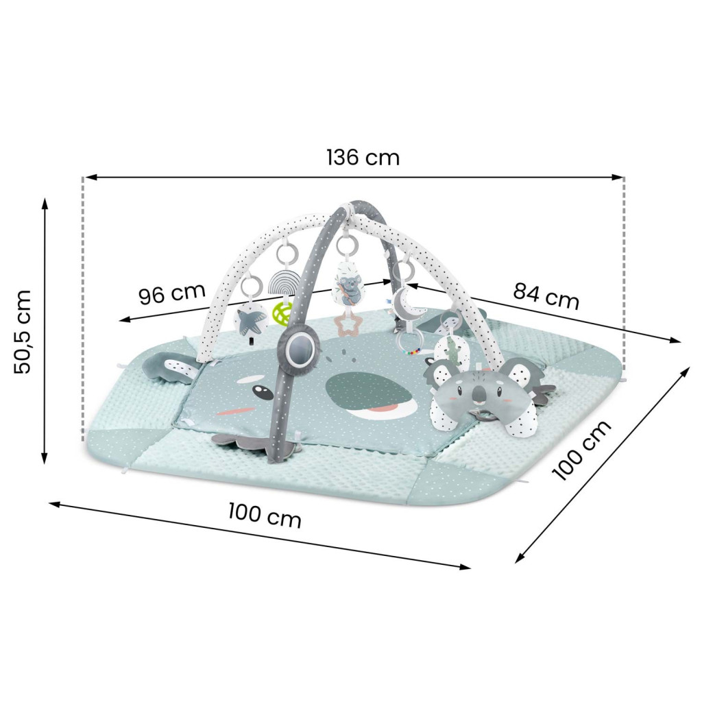 Fedezd fel a Nukido Koala interaktív oktató játszószőnyeget! A 136 x 136 cm-es, kétoldalas plüss-poliészter felület puha, mégis könnyen tisztítható alapot ad a biztonságos játékhoz. Öt felhajtható oldalfala tépőzárral rögzíthető, így egyszerre kuckó és tágas szőnyeg. A két levehető íven hét cserélhető játék függ: csörgő, tükrös, zörgő és sípoló figurák, valamint egy puha koala pocakpárna, amely a hason fekvést is támogatja.