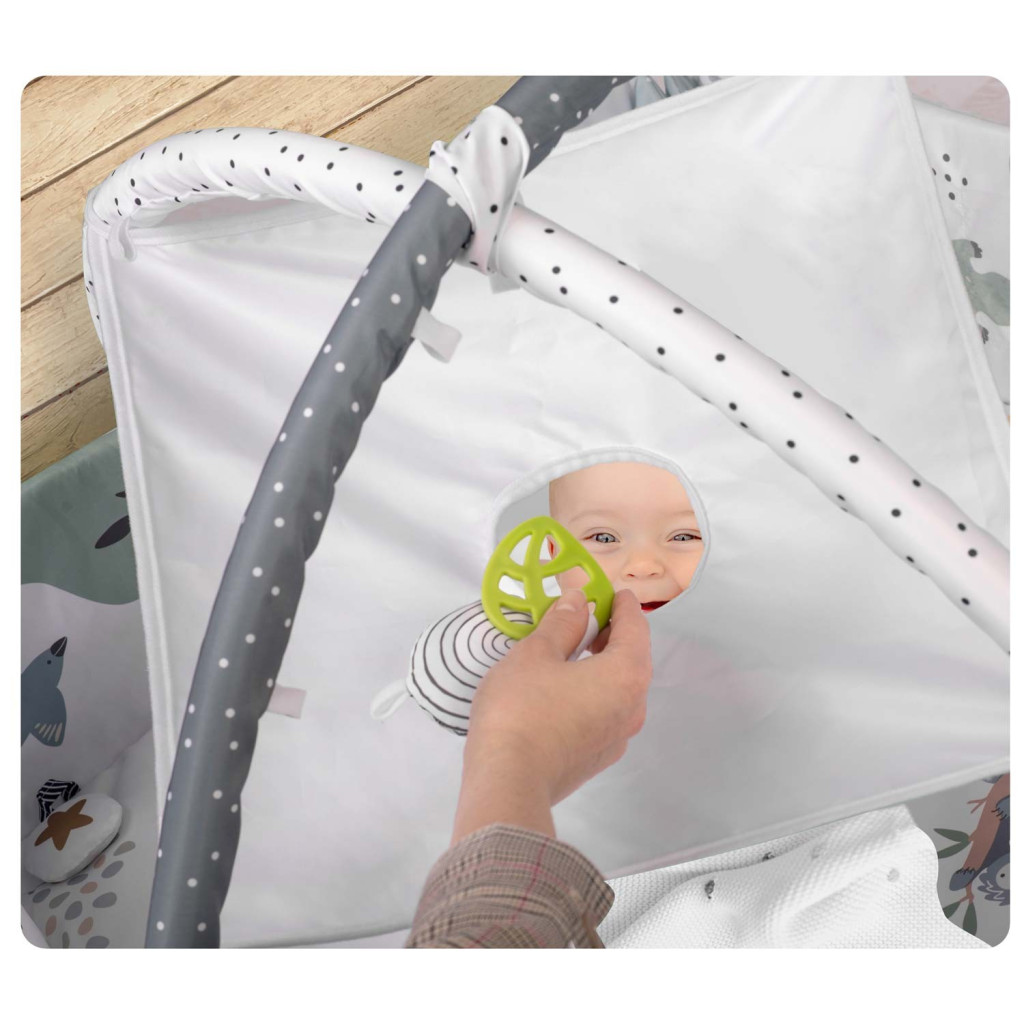 Ez a tágas játszótér együtt nő a babával: újszülött korban a fej fölött lógó játékok erősítik a tekintet- és fogáskoordinációt, később leterítve szabad mozgást ad a forgás, kúszás, ülés gyakorlásához. A felhajtható oldalfalak védetten tartják a játékokat és megfékezik a guruló labdákat. A három érzékelő zseb saját fényképekkel, rajzokkal személyre szabható, a bújócska-lap vidám kukucs játékra csábít. A CE jelölés és az európai biztonsági vizsgálatok nyugalmat adnak a szülőknek.