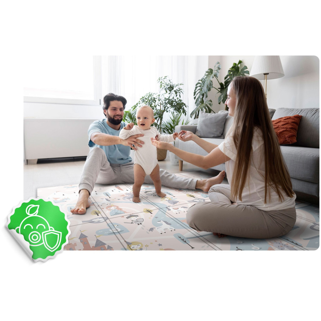 Az összehajtható szőnyeg pillanatok alatt hordozható méretre zsugorítható, így a nappalitól a teraszig mindenhol komfortos, tiszta és meleg felületet teremt. Az XPE hab BPA-, PVC-, ftalát- és formamidmentes, ezért azoknak a babáknak is biztonságos, akiknél fontos a hipoallergén környezet. A csúszásgátló domborulatok segítik a stabil kúszást és járástanulást, míg az 1 cm-es réteg hatékonyan óvja a kis térdeket a kemény padlótól. CE és EN71 tanúsítványa garantálja a nyugodt szülői lelket.