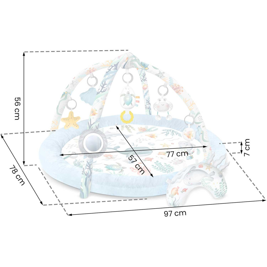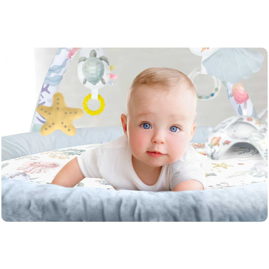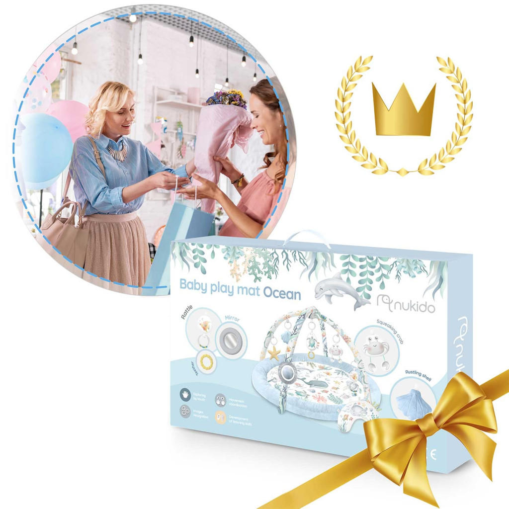 Merülj el az óceán csodáiban a Nukido Ocean interaktív játszószőnyeggel! A puha, világoskék perem ölelő kokont alkot, a levehető íveken pedig hét izgalmas játék lengedez: csillag, teknős, rák, kagyló, tükör és csörgők, melyek hangja és tapintása ösztönzi a baba felfedezőkedvét. A csomagban található hasaltatópárna kényelmes támaszt nyújt, a könnyen tisztítható, vastag anyag pedig melegen szigetel a padlótól. A gyors összecsukhatóságnak köszönhetően bárhová magaddal viheted.