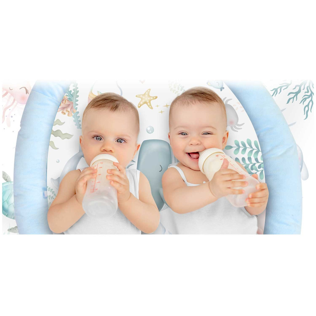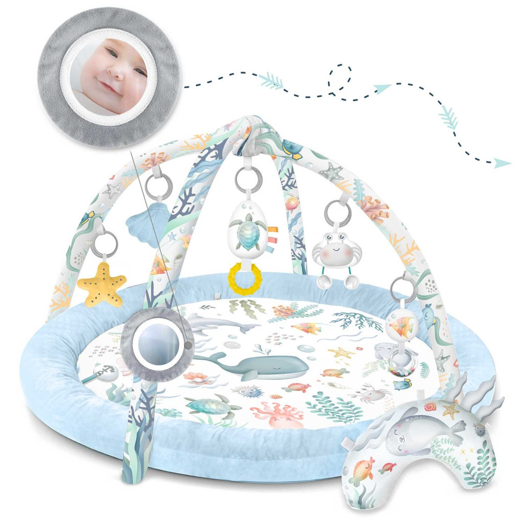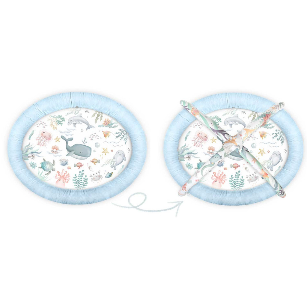 Merülj el az óceán csodáiban a Nukido Ocean interaktív játszószőnyeggel! A puha, világoskék perem ölelő kokont alkot, a levehető íveken pedig hét izgalmas játék lengedez: csillag, teknős, rák, kagyló, tükör és csörgők, melyek hangja és tapintása ösztönzi a baba felfedezőkedvét. A csomagban található hasaltatópárna kényelmes támaszt nyújt, a könnyen tisztítható, vastag anyag pedig melegen szigetel a padlótól. A gyors összecsukhatóságnak köszönhetően bárhová magaddal viheted.