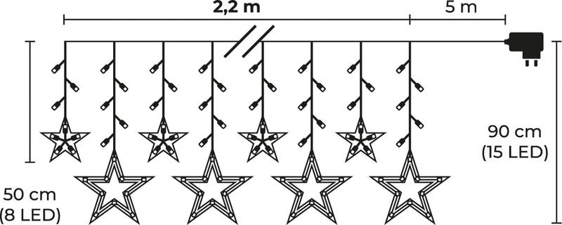 Varázsolj szikrázó, téli fényt otthonodba a MagicHome Curtain LED függönyfényével! A 138 hidegfehér LED-ből álló, csillag alakú díszekkel ékesített füzér 220 cm hosszan terül el, a csillagok 60 és 90 cm közötti lelógó szálakon hintáznak, így igazi „fényes hóesés” hatást keltenek. 230 V-os hálózatról működik, strapabíró PVC kábellel, ezért ablakra, falra, erkélykorlátra vagy beltéri dekorációként is könnyedén rögzíthető. Energiatakarékos LED technológiája alacsony fogyasztást garantál.