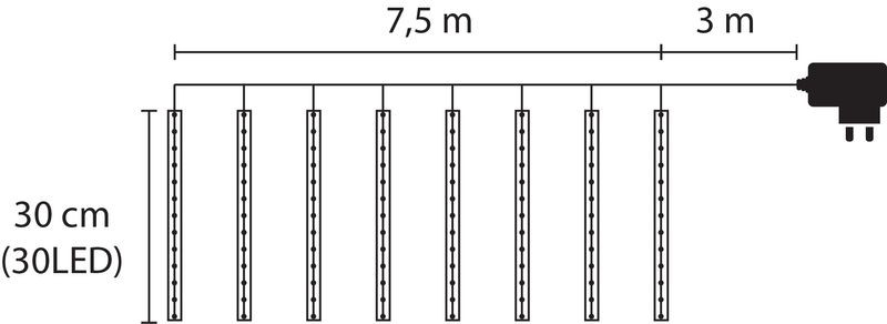 • 7,5 m fénylánc + 3 m tápkábel: rugalmas elhelyezés kültéren