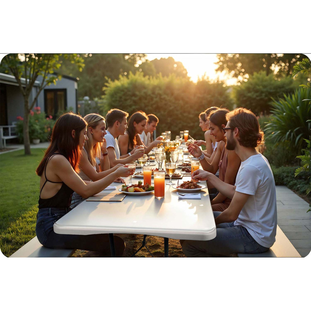 Egyszerre akár tíz személyt is kényelmesen leültethetsz köré, így ideális családi ünnepekre, grillpartikra vagy céges fogadásokra. Pár mozdulattal kihajtható, a reteszek biztonságosan rögzítik a lábakat, hogy ne inogjon. A hordozófogantyúval könnyen áthelyezheted, a sima felületre pillanatok alatt felterítheted az étkészletet. Beltéren és kültéren egyaránt használható, hiszen a strapabíró alapanyagok jól bírják a nedvességet és a napfényt.