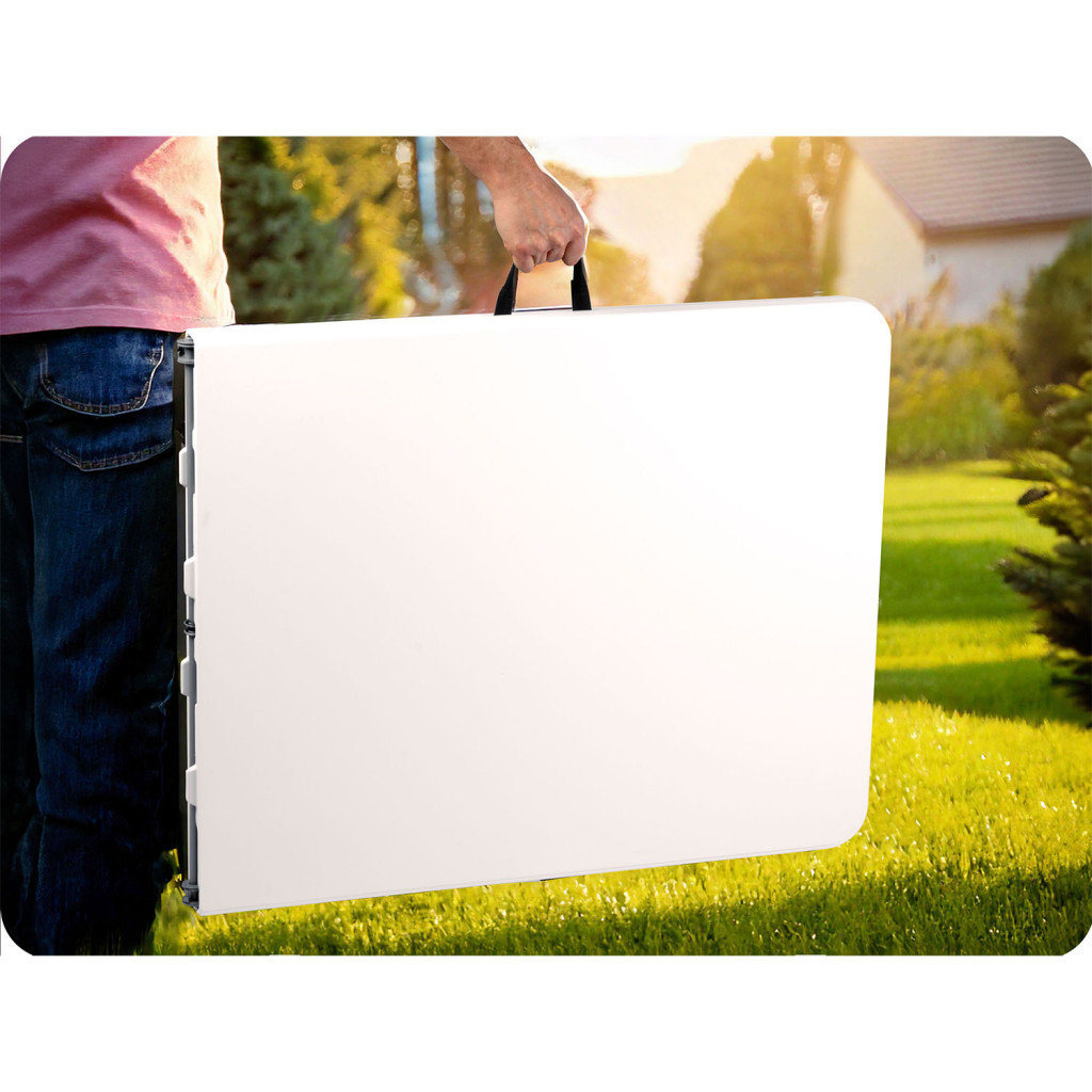 A Plonos 244 cm-es, összecsukható cateringasztallal percek alatt vendégváróvá alakíthatod a kertet vagy a rendezvényhelyszínt. A hófehér, sima műanyag asztallap elegánsan mutat, miközben ellenáll az időjárásnak és könnyen tisztítható. A porszórt acél lábak stabil tartást adnak, a 18,6 kg-os súly pedig egyszerre garantál masszívitást és hordozhatóságot. Összezárva praktikus bőröndformát kap fogantyúval, így kis helyen elfér az autó csomagtartójában vagy a garázsban.