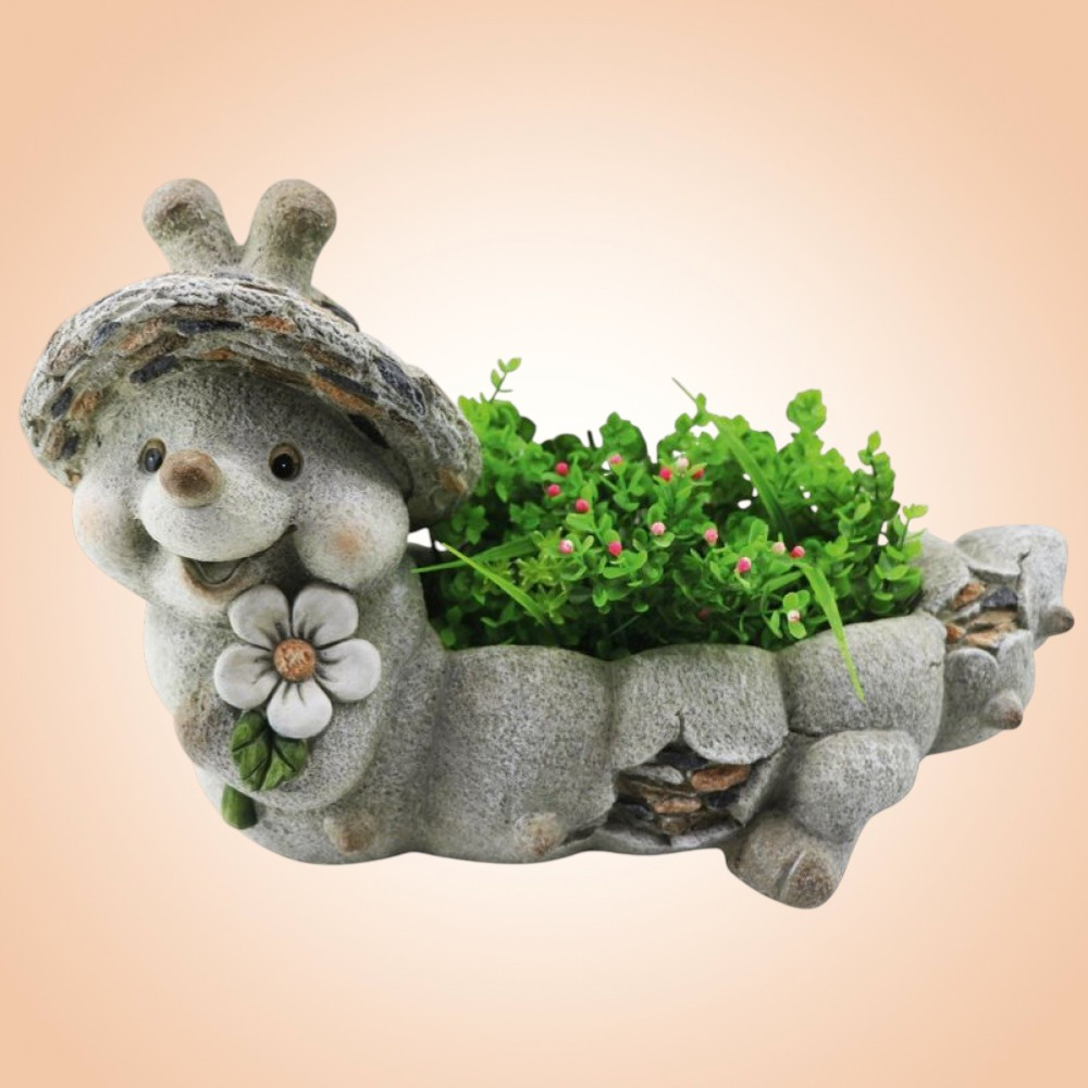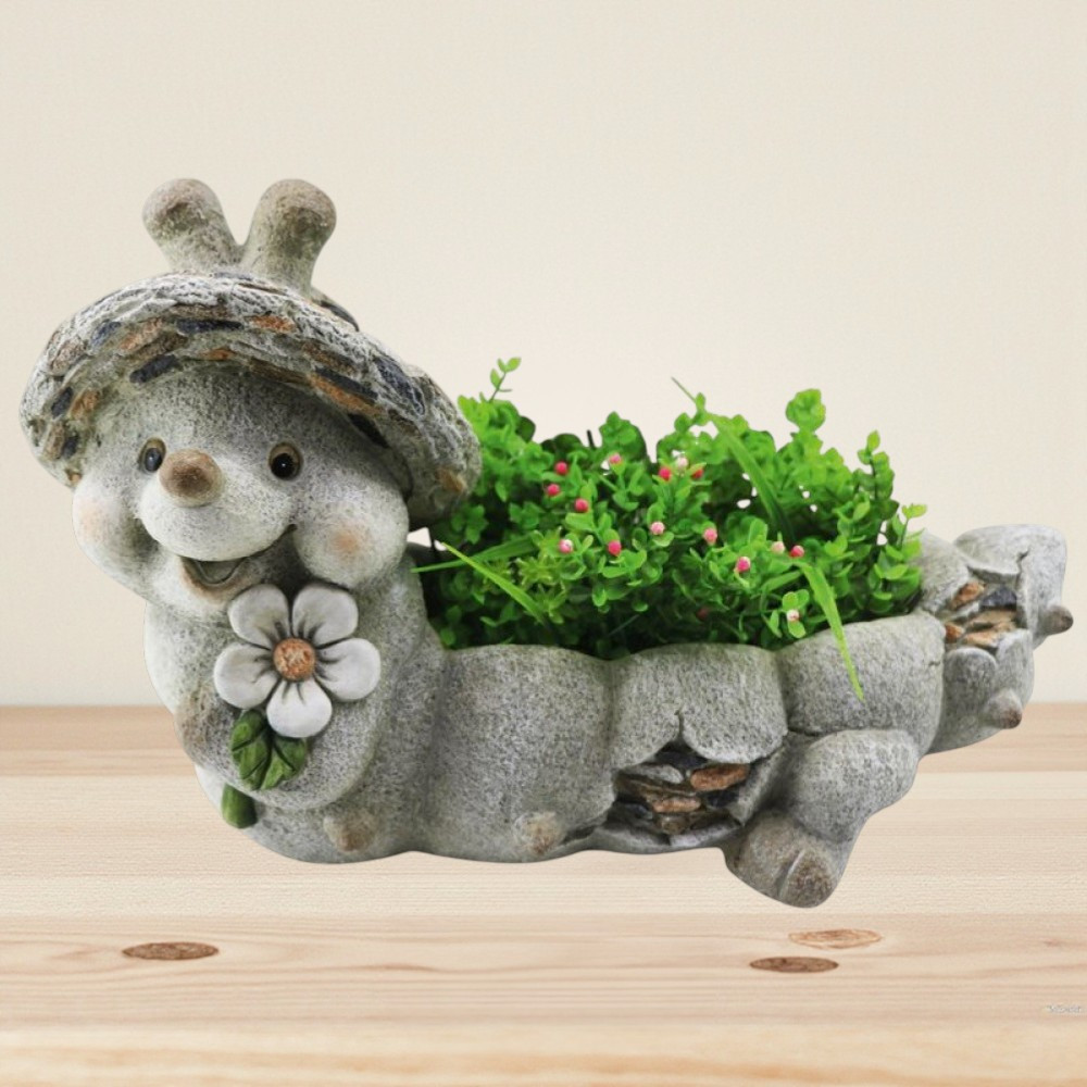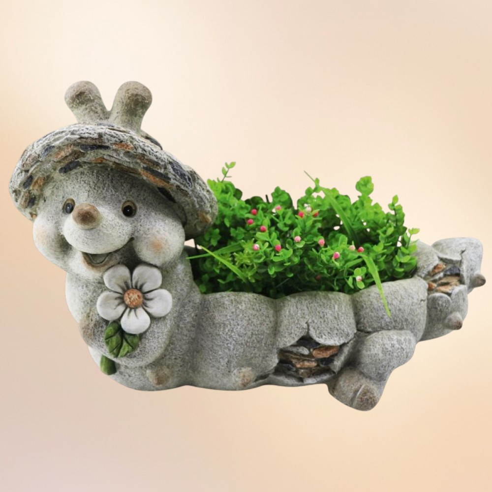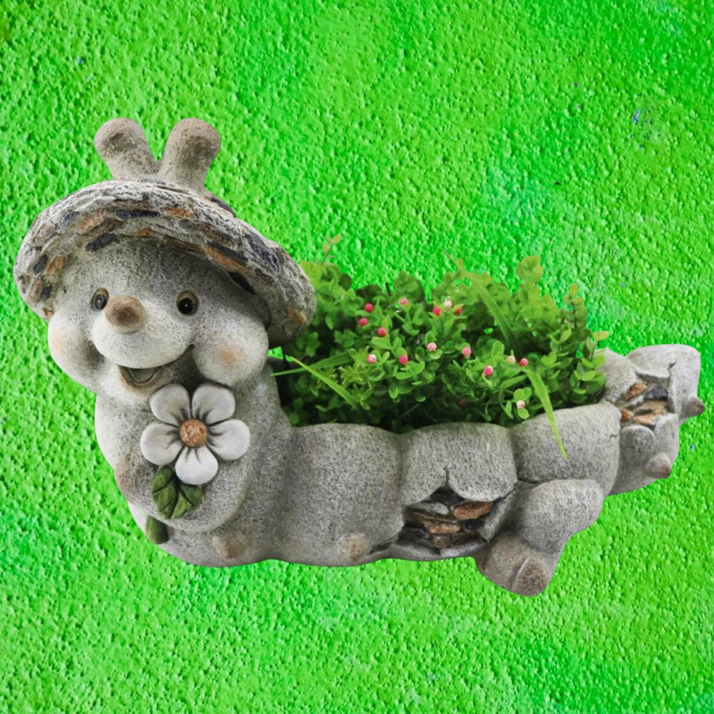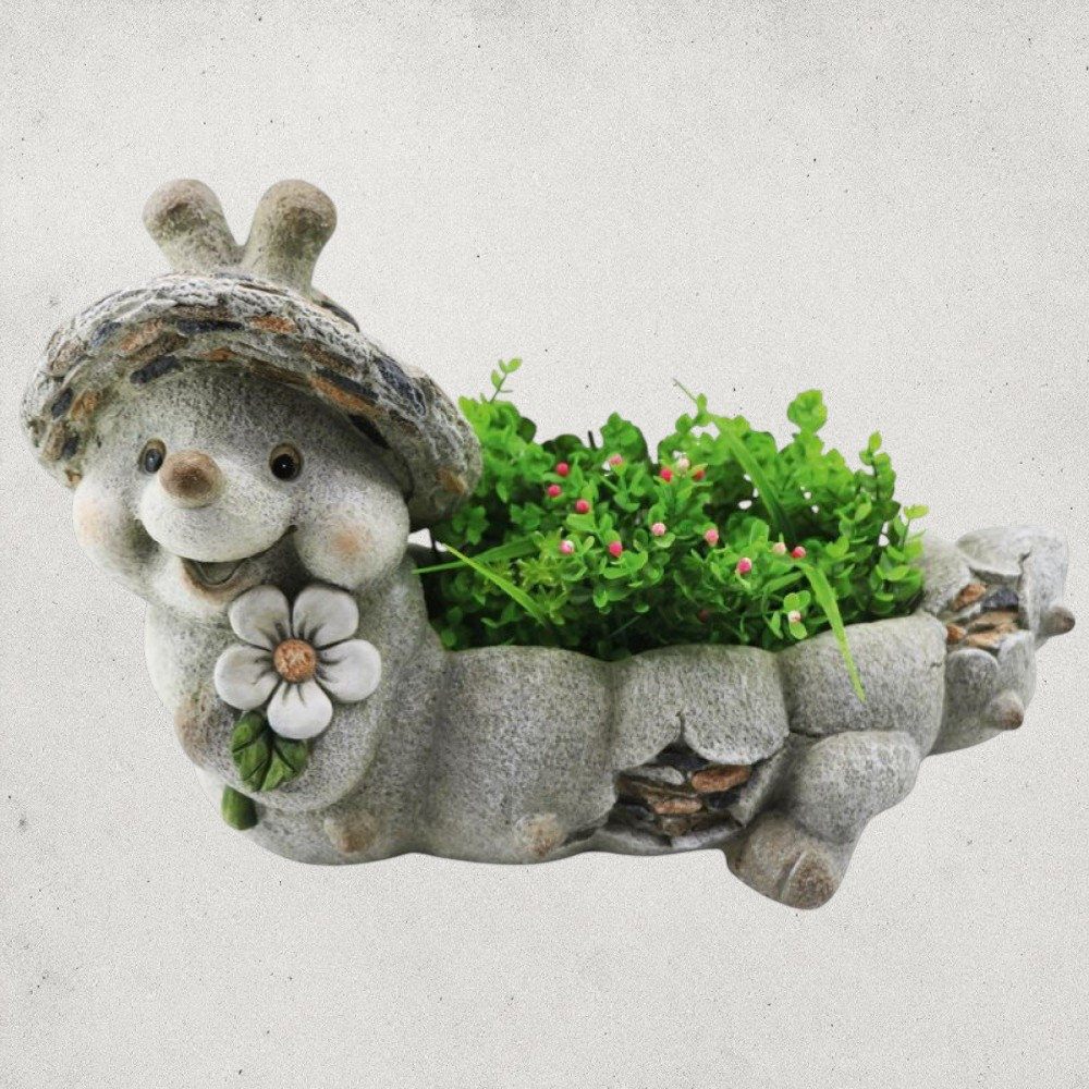 Ez a játékos dísz egyszerre szolgál virágcserépként és hangulatfokozó kertszoborként, így két funkciót kapsz egyben. A magnézia anyag kevés gondozást igényel, nem repedezik, nem fakul ki a napsütésben. A gondosan kidolgozott részletek – az arc bájos pírja, a kőhatású pikkelyek, a festett virág – minden korosztály arcára mosolyt csalnak. Könnyen mozgatható, mégis elég masszív, hogy a szél ne borítsa fel.