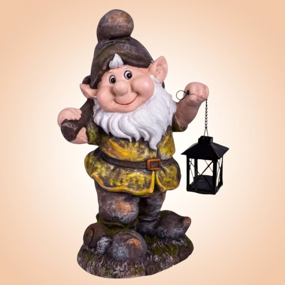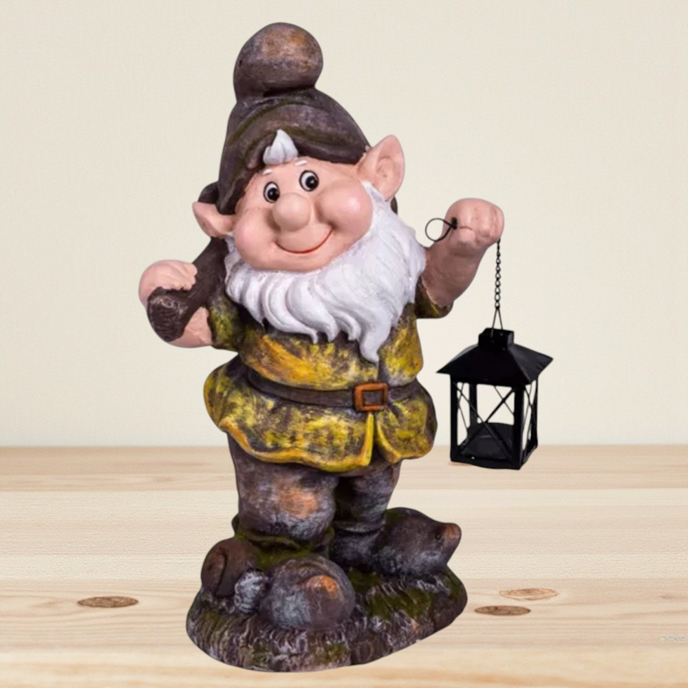 Ez a mosolygós törpe azonnal vidámságot csempész otthonodba. A masszív magnézia test nem repedezik a hőmérséklet-változástól, a kézzel festett árnyalatok pedig nem fakulnak a napsütésben. A felfüggesztett lámpásban elfér egy LED tea fény vagy microfényfüzér, így a figurát nappal dekorációként, sötétedés után pedig bájos fényforrásként használhatod. Kompakt mérete miatt egyszerűen mozgatható, mégis elég feltűnő, hogy a vendégek azonnal észrevegyék.