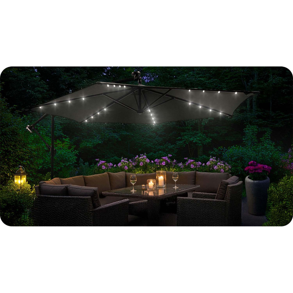 Ez a 13,7 kg súlyú, porszórt acélvázas napernyő stabilan ellenáll a nyári szélnek, mégis egy kényelmes tekerőkarral pillanatok alatt nyitható és zárható. A 360°-ban forgatható talp és a dönthető kar révén a nap járását követve bármikor árnyékot biztosít. A napelemes LED fények energia- és kábelmentes világítást adnak, így estére sem kell külön lámpákkal bajlódnod. Kompakt méretre csukható, ezért tárolása télen is egyszerű.