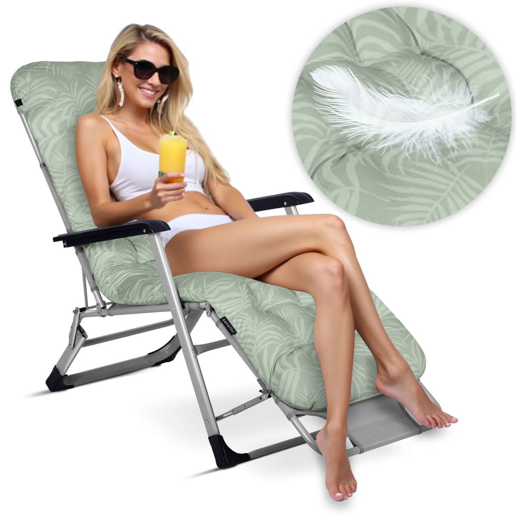 A Sofotel ChillWell összecsukható kerti nyugágy szett igazi meghívó a pihentető napozáshoz. A két darab, légiesen világos zöld huzattal és vastag, steppelt párnával készült nyugágy stabil acélvázzal rendelkezik, így masszívan tart, mégis könnyedén mozgatható. Dőlésszöge több fokozatban állítható, akár teljesen fekvő pozícióig, így olvasáshoz, szundikáláshoz vagy napfürdőzéshez is tökéletes. Összecsukva alig foglal helyet, autó csomagtartóban is elfér.