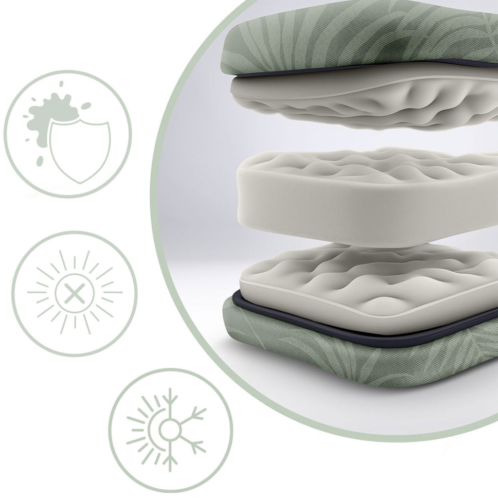 A ChillWell nyugágyak a klasszikus kempingfotelek kényelmét ötvözik a luxus napozóágyak puhaságával. A plüssös, gombos varrású párna hosszan tartó komfortot ad, miközben a légáteresztő textília nem melegszik túl a napon. A karfába simuló kartámaszok stabil fogást kínálnak, a vázon található lábrögzítő pedig megakadályozza a véletlen becsukódást. A két az egyben csomaggal partnereddel egyszerre élvezhetitek a felhőtlen pihenést.