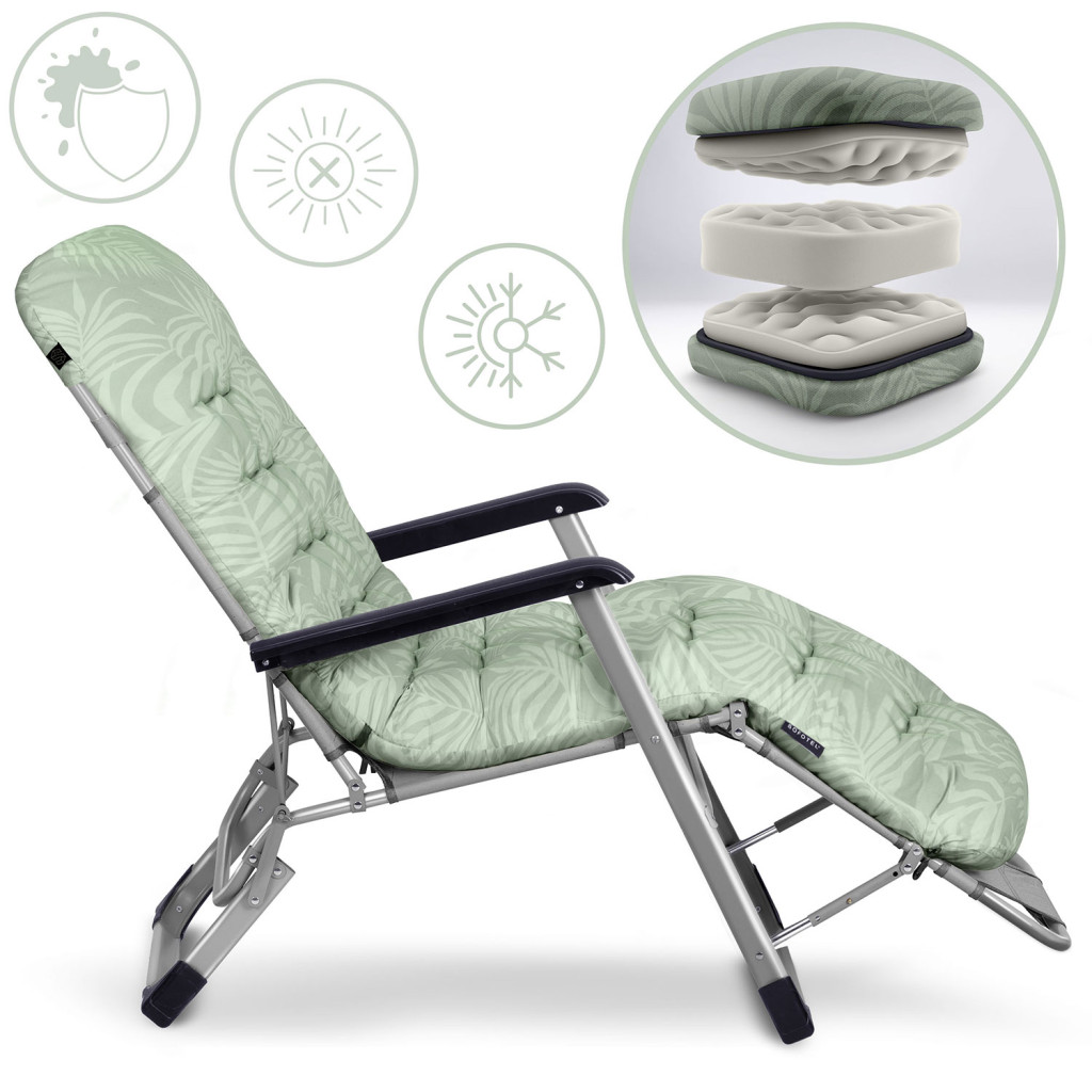 Engedd, hogy a pihentető napsütés igazi luxusélménnyé váljon a Sofotel ChillWell világoszöld összecsukható kerti nyugággyal! Könnyű, mégis erős alumínium váza stabil tartást ad, a vastag, levehető párna pedig finom puhaságba burkolja tested minden pontját. A több fokozatban állítható háttámla és lábtartó révén pillanatok alatt megtalálhatod a tökéletes dőlésszöget, akár napozol, akár olvasol. Összecsukva alig foglal helyet, így teraszon, erkélyen vagy utazáskor is könnyedén magaddal viheted.