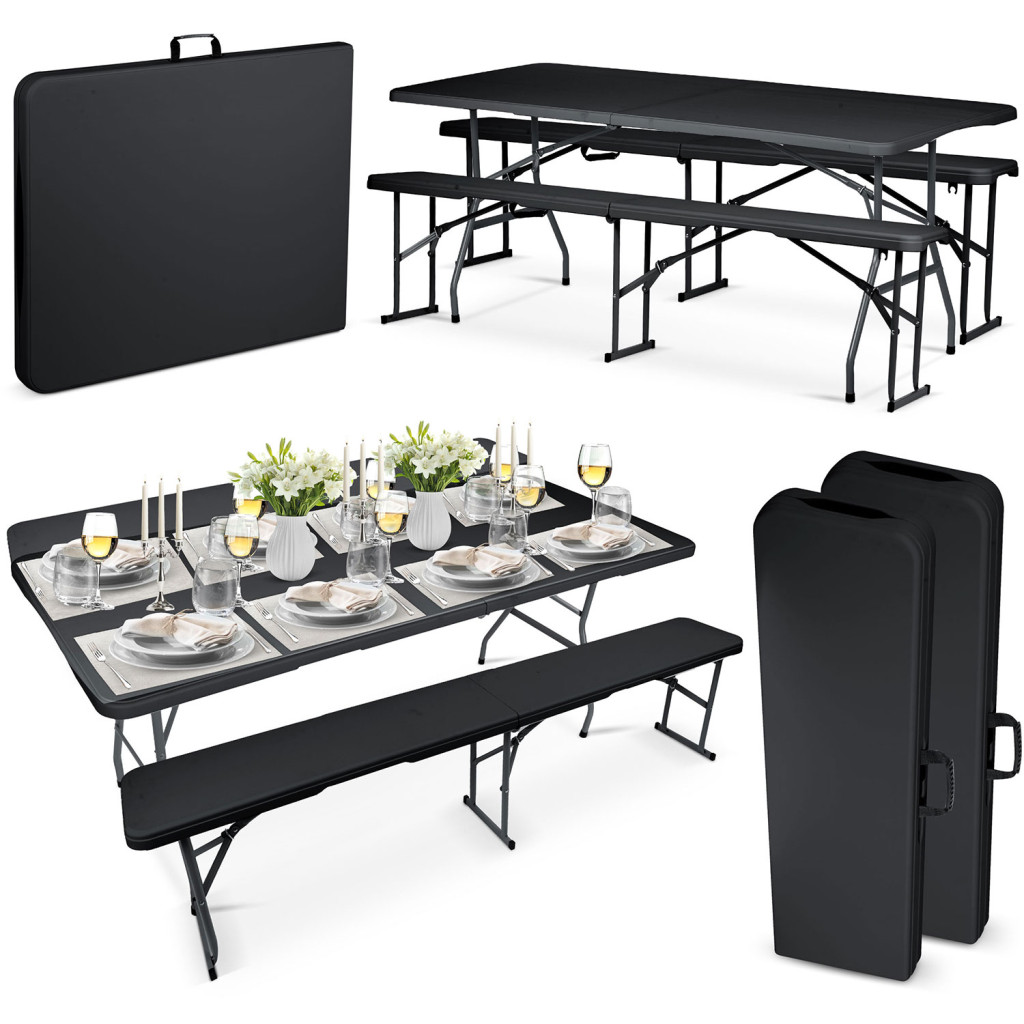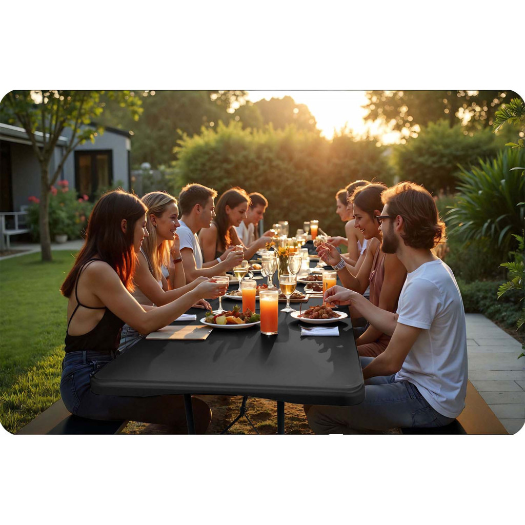 Ha gyorsan szeretnél egy komplett ülőhelyet varázsolni a kertbe, strandra vagy céges piknikre, ez a szett tökéletes társ. Néhány mozdulattal felállítható, majd ugyanilyen egyszerűen összecsukható, így autó csomagtartójában is kényelmesen elfér. A stabil keresztmerevítők megakadályozzák a billegést, a sima asztallap könnyen letörölhető nedves ruhával, így mindig rendezett környezetben fogadhatod vendégeidet.