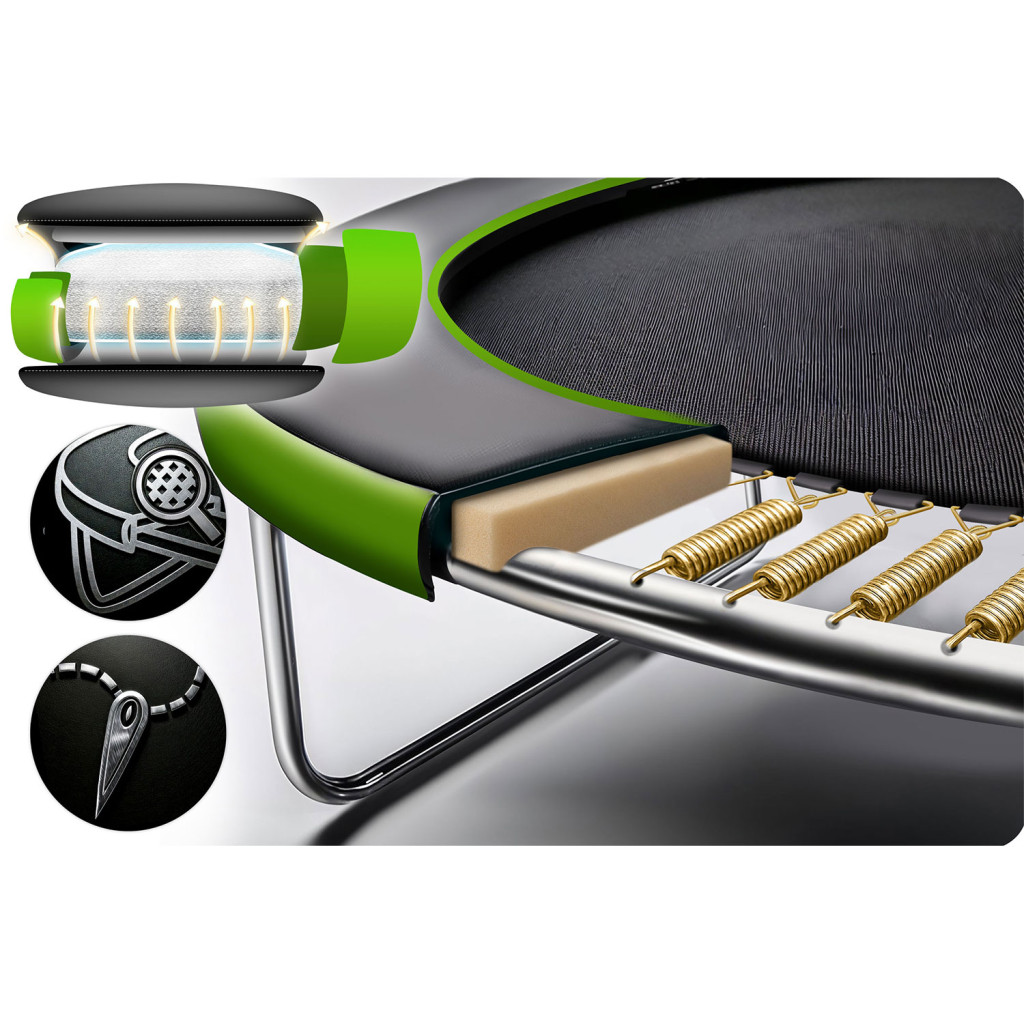 Élvezd a szabadtéri ugrálás felszabadító örömét a Neo-Sport 12 lábas (374 cm) kerti trambulinnal! A masszív, horganyzott acél váz és a sűrűn szőtt, külső rögzítésű biztonsági háló stabil védelmet nyújt, míg a puha peremvédő óvja a rugókat és a lábakat. A mellékelt létra megkönnyíti a fel- és leszállást, így a család apraja-nagyja könnyedén csatlakozhat a mókához. Fekete-zöld dizájnja stílusos kiegészítője bármely kertnek.