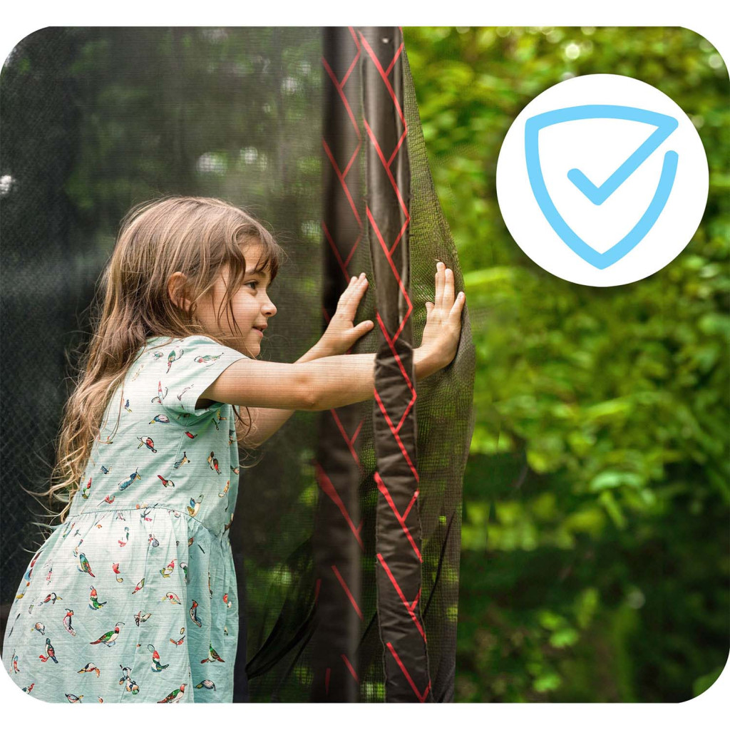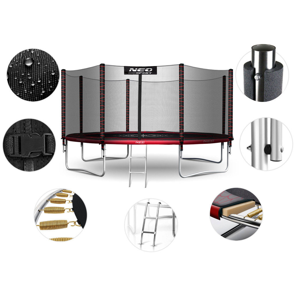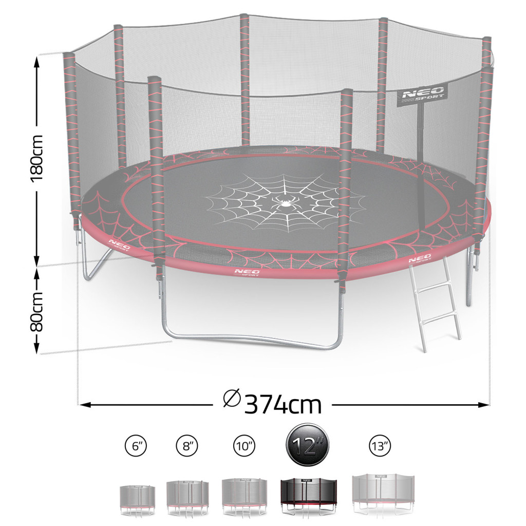 Változtasd a kertet igazi élményparkká a Neo-Sport 12 ft/374 cm kerti trambulinnal! A négy duplán hajlított „U” lábon álló, kívül-belül horganyzott acélváz rendíthetetlen stabilitást nyújt, míg a vastag, PVC-vel burkolt szivacspárna elrejti a 64 hosszított rugót. A pók-hálómintás ugrófelület gyorsan száradó anyagból készült, így eső után pillanatok alatt újra bevethető. A 180 cm magas, cipzárral zárható külső háló és a kétfokú fém létra gondoskodik a biztonságos ki- és belépésről, akár 150 kg terhelésig.