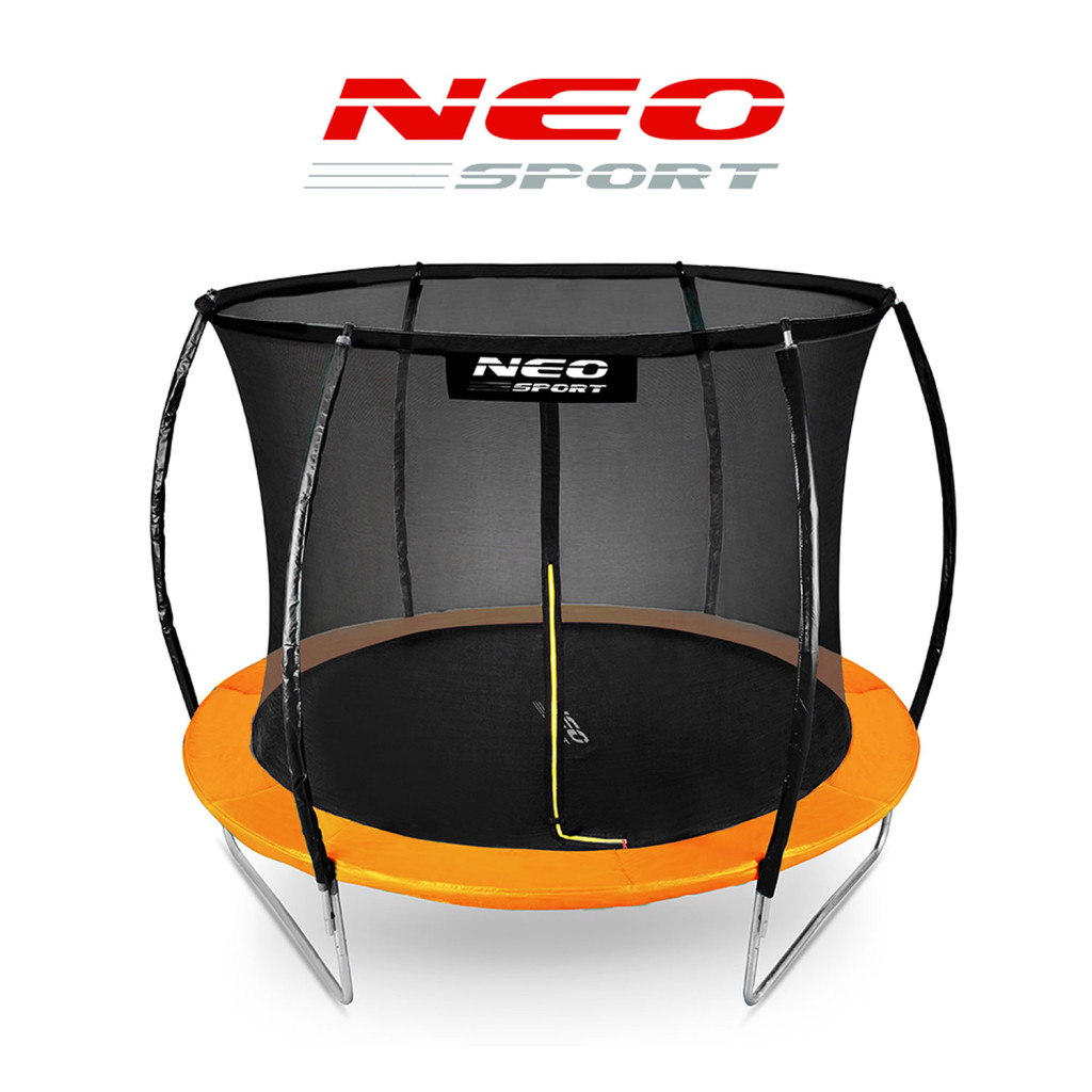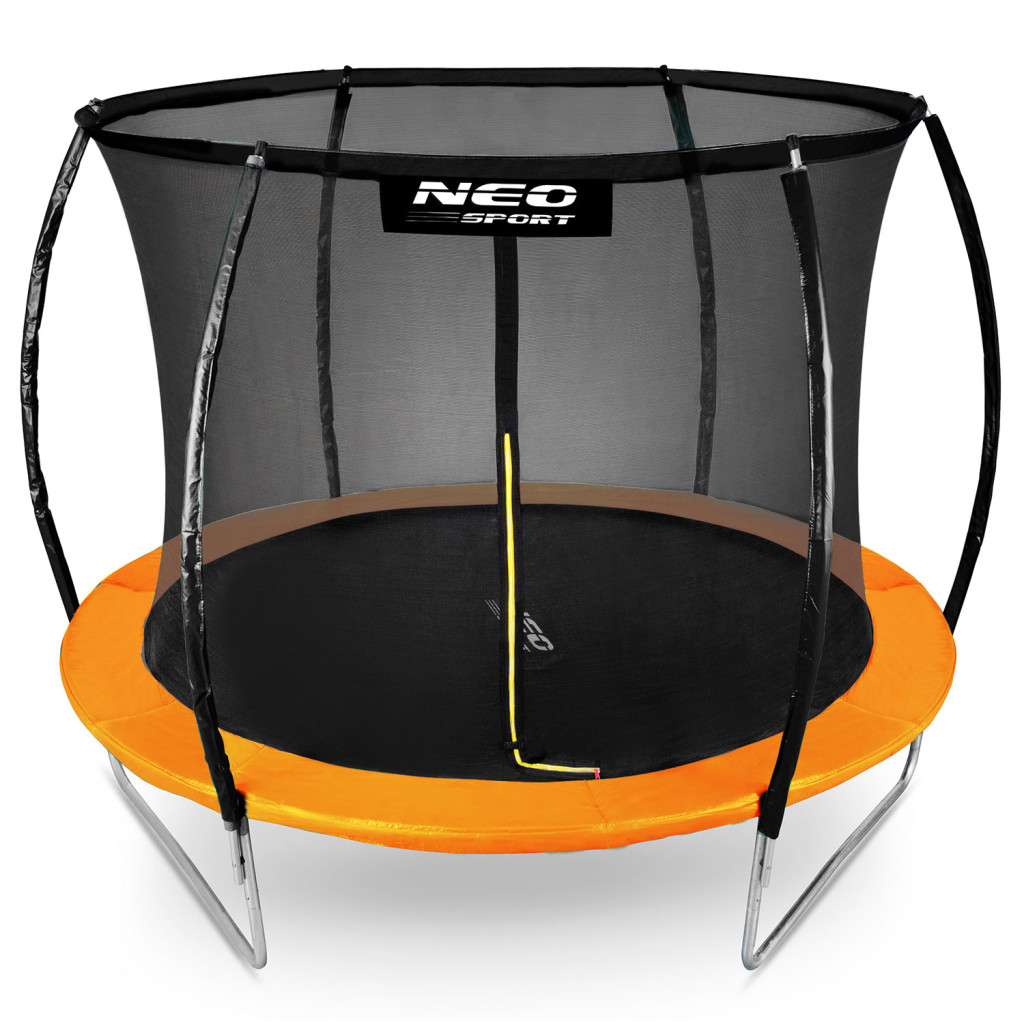 A Neo-Sport 10ft/312 cm profilált kerti trambulin belső védőhálóval igazi élményközpont a kertben. A teljesen horganyzott, porfestett acélváz három dupla U-alakú lábon áll, így stabilan ellenáll az ugrálásnak. A 54 rugóval feszített, vízlepergető ugrófelület nagy terhelést is elbír, míg a narancssárga peremszivacs elrejti a rugókat és óvja a lábakat. A 180 cm magas belső háló a puha habbal borított, ívelt oszlopokra simul, L-alakú cipzáras bejárata pedig gyorsan zárható, hogy az apróságok is biztonságban maradjanak.