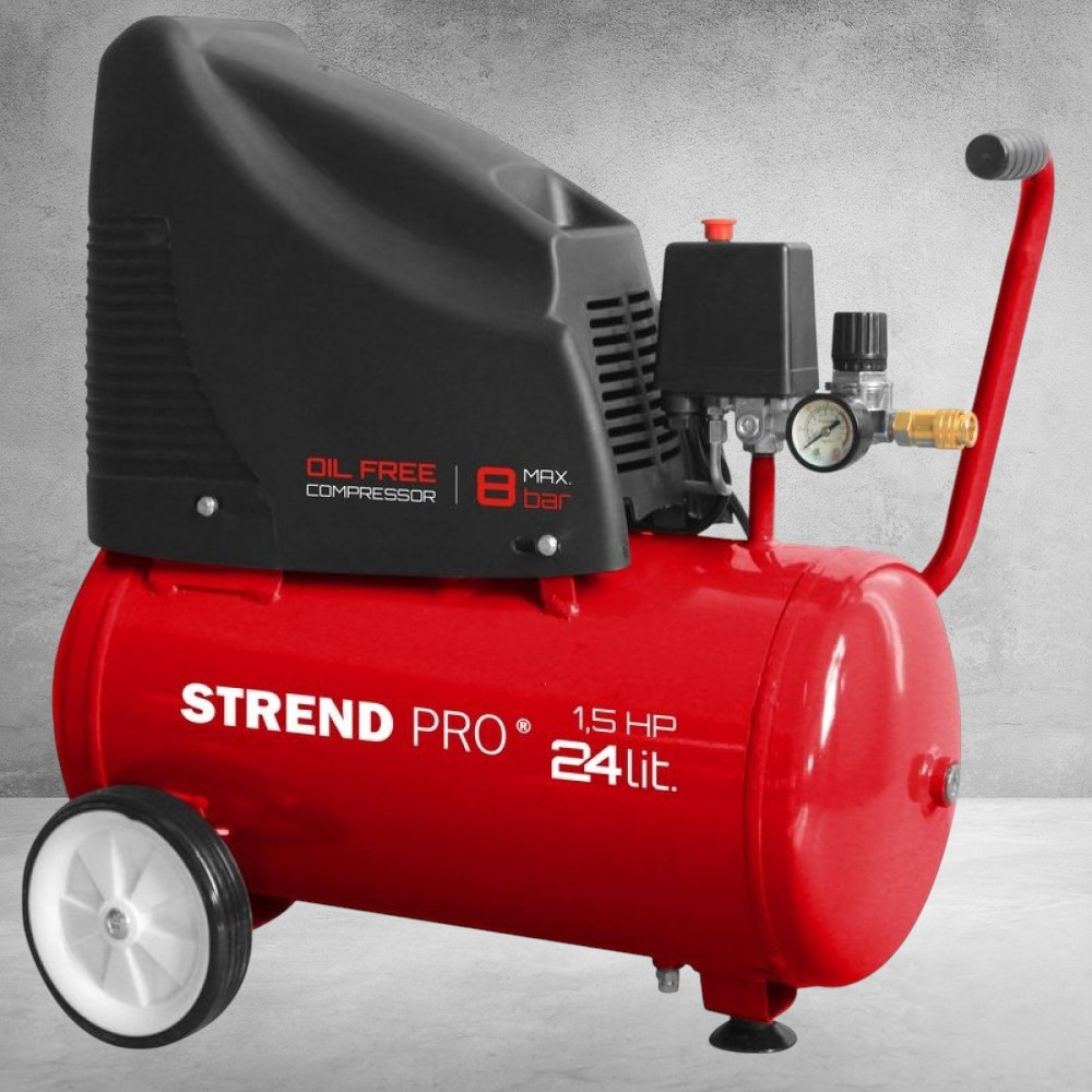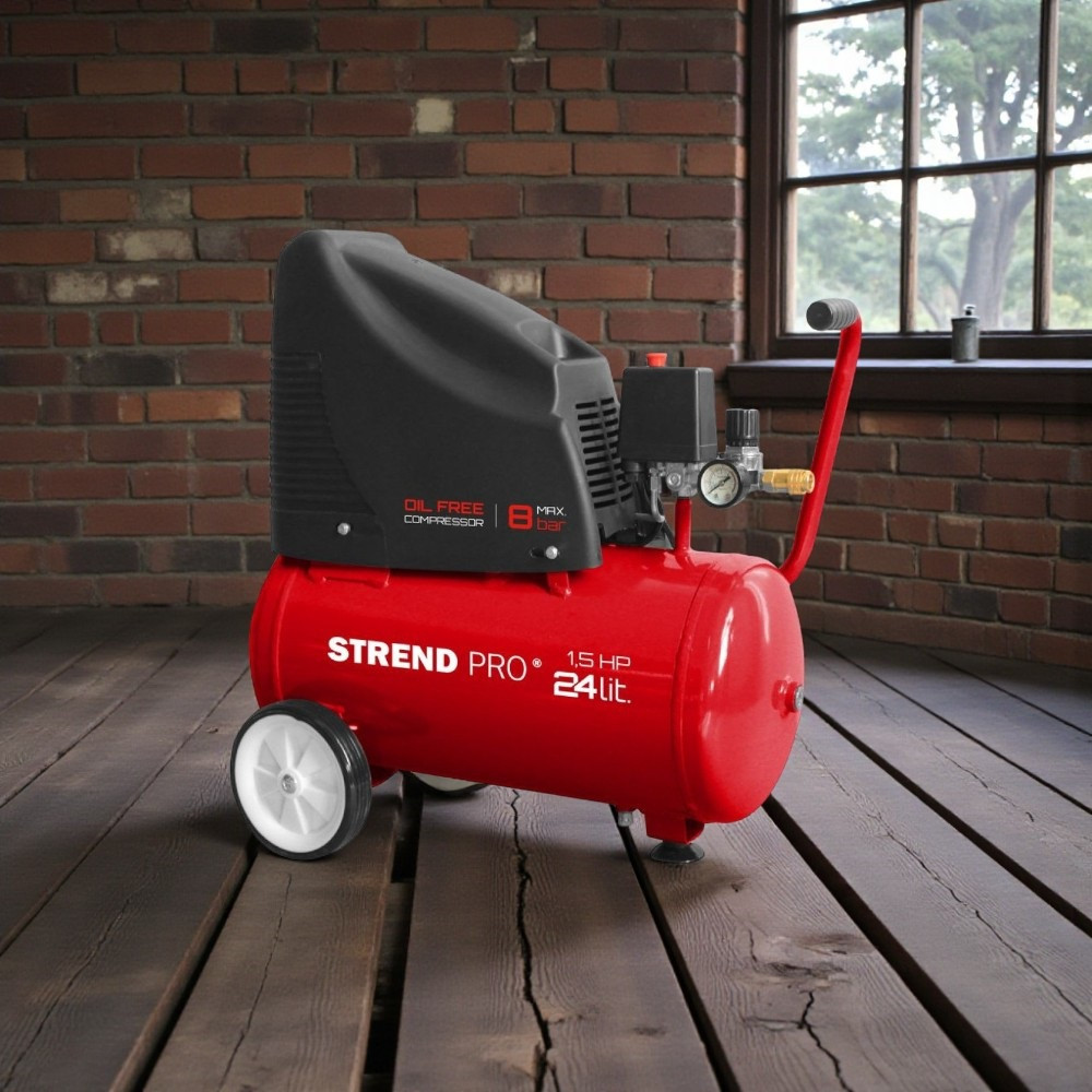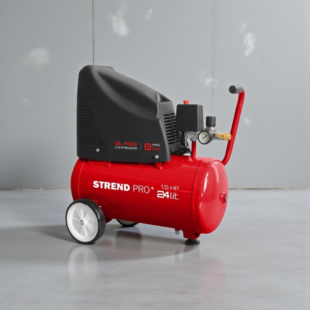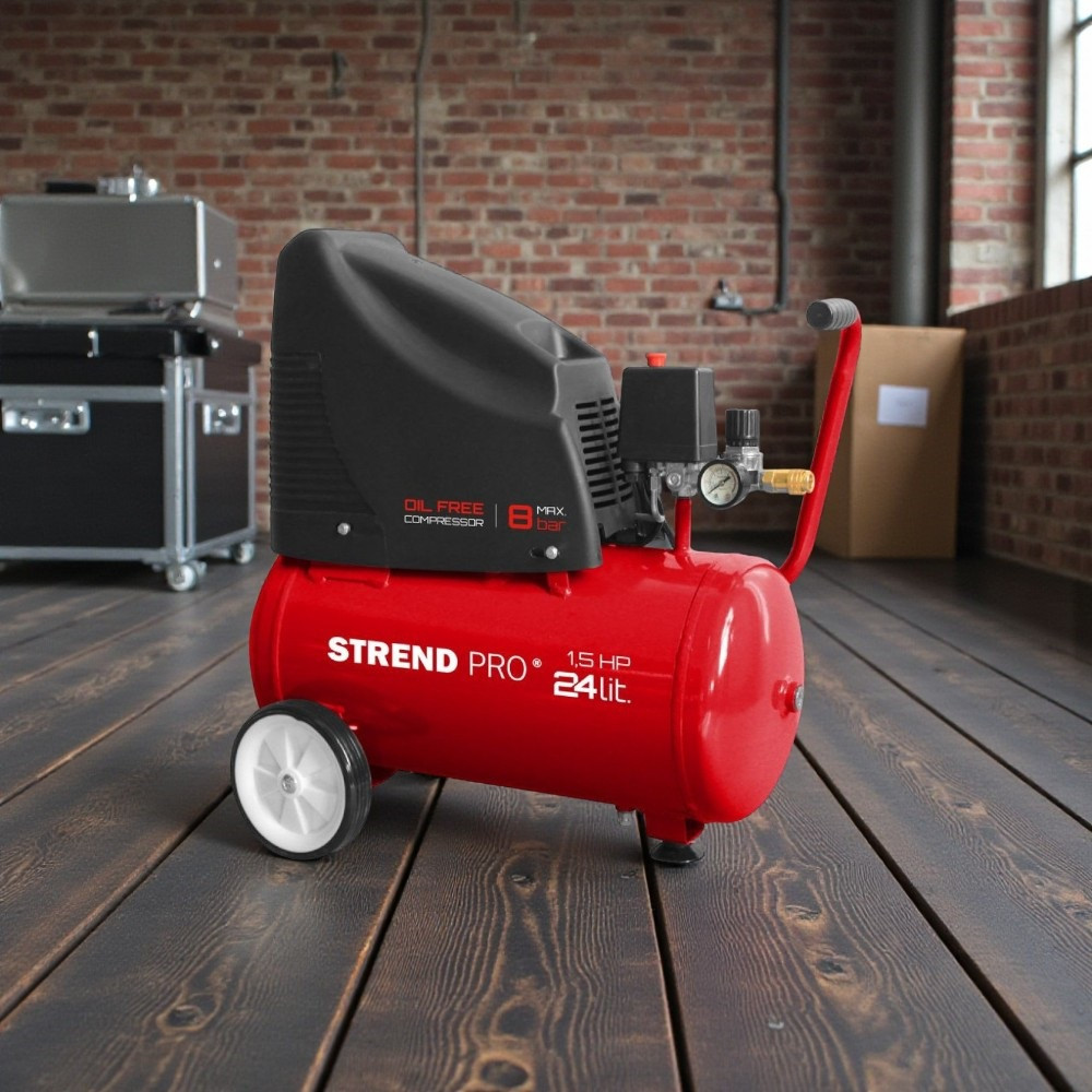 A Strend Pro OF1524 olajmentes kompresszor 1,1 kW-os, egyhengeres motorjával és 24 literes tartályával megbízható segítőtárs a műhelyben, garázsban vagy bárhol, ahol stabil sűrített levegőre van szükség. A maximum 8 bar üzemi nyomás bőven elegendő pneumatikus szerszámok, festékszórók, fúvópuskák vagy kerékfújók meghajtásához. A beépített nyomásszabályzóval pontosan beállíthatod a kívánt értéket, míg a masszív acéltartály biztosítja a folyamatos levegőellátást.