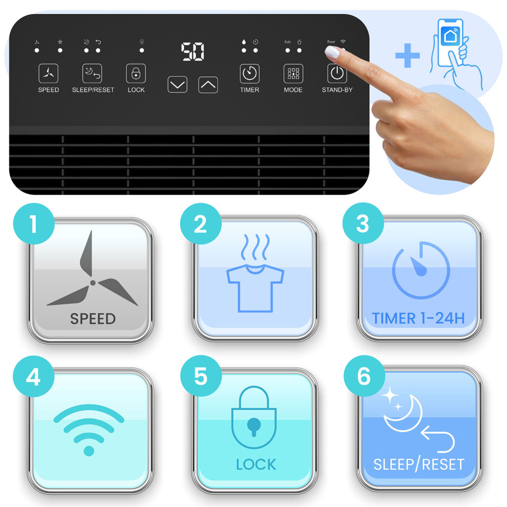 • Tuya alkalmazásvezérlés – páratartalom, időzítő és üzemmód állítás bárhonnan