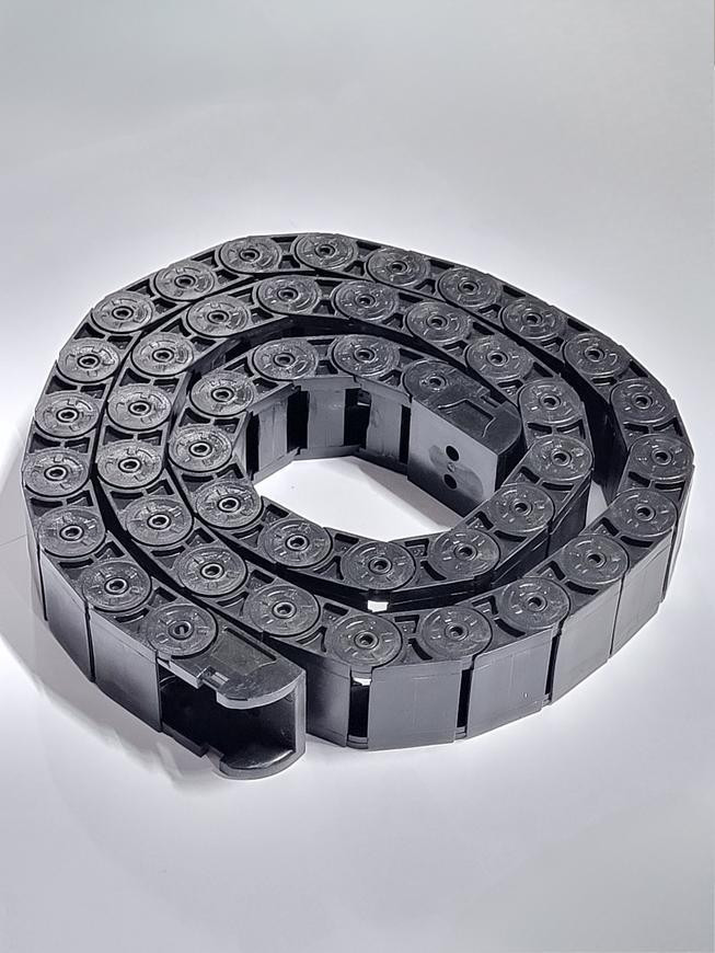 A Worcraft TC-800 (alkatrészszám 44) egy masszív, fekete műanyagból készült, szegmensenként összekapcsolt lánc, amely ideális megoldás a mozgó gépeken futó kábelek és vezetékek rendezett, biztonságos elvezetésére. Moduláris felépítése révén könnyen méretre szabható, így pontosan igazítható a kívánt hosszhoz. A zárt kialakítás védi a vezetékeket a mechanikai sérülésektől, miközben elegáns, letisztult megjelenést kölcsönöz a gépnek.