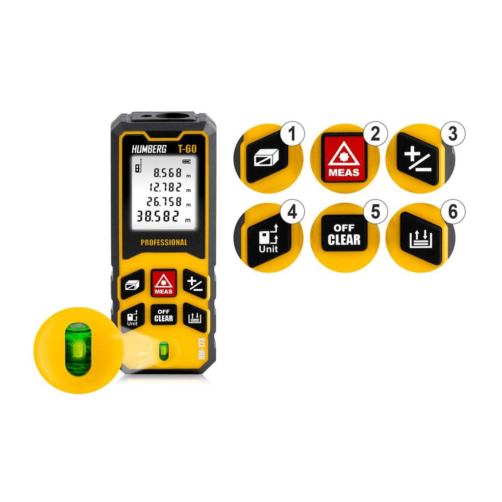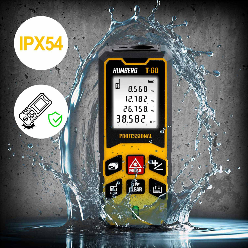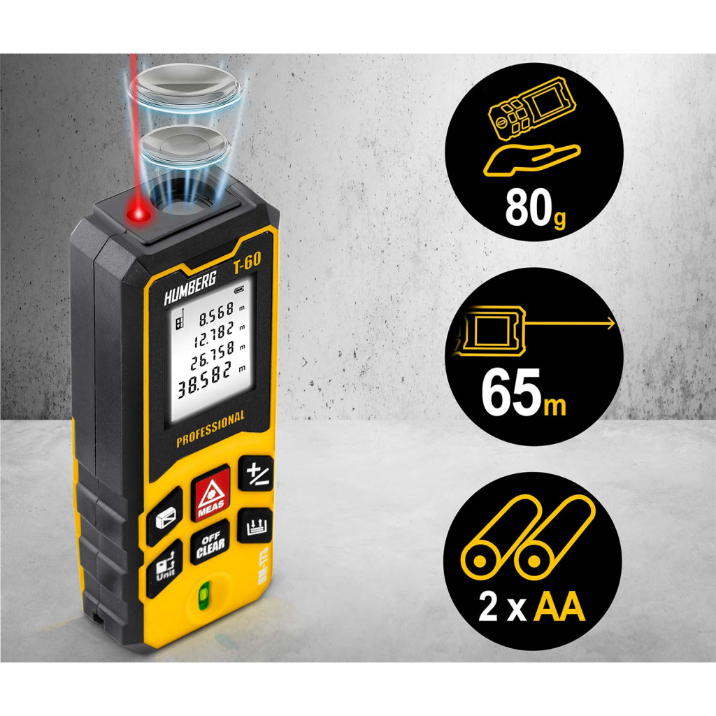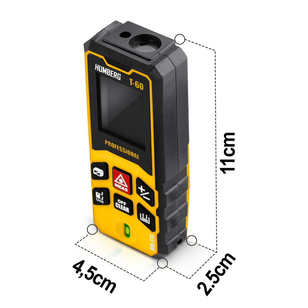 A Humberg HM-173 lézeres távolságmérővel pillanatok alatt pontos adatokat kapsz akár 60 méterig. A mindössze 11 × 4,5 × 2,5 cm-es, 80 grammos készülék könnyen elfér a zsebedben, mégis profi teljesítményt nyújt: ±1,5 mm pontosság, terület- és térfogatszámítás, folyamatos mérés vagy Pitagorasz-funkció egyetlen gombnyomásra. Nagyméretű háttérvilágított kijelzőjén jól olvashatók az eredmények, az IPX54 védettség pedig megóvja a portól, nedvességtől.