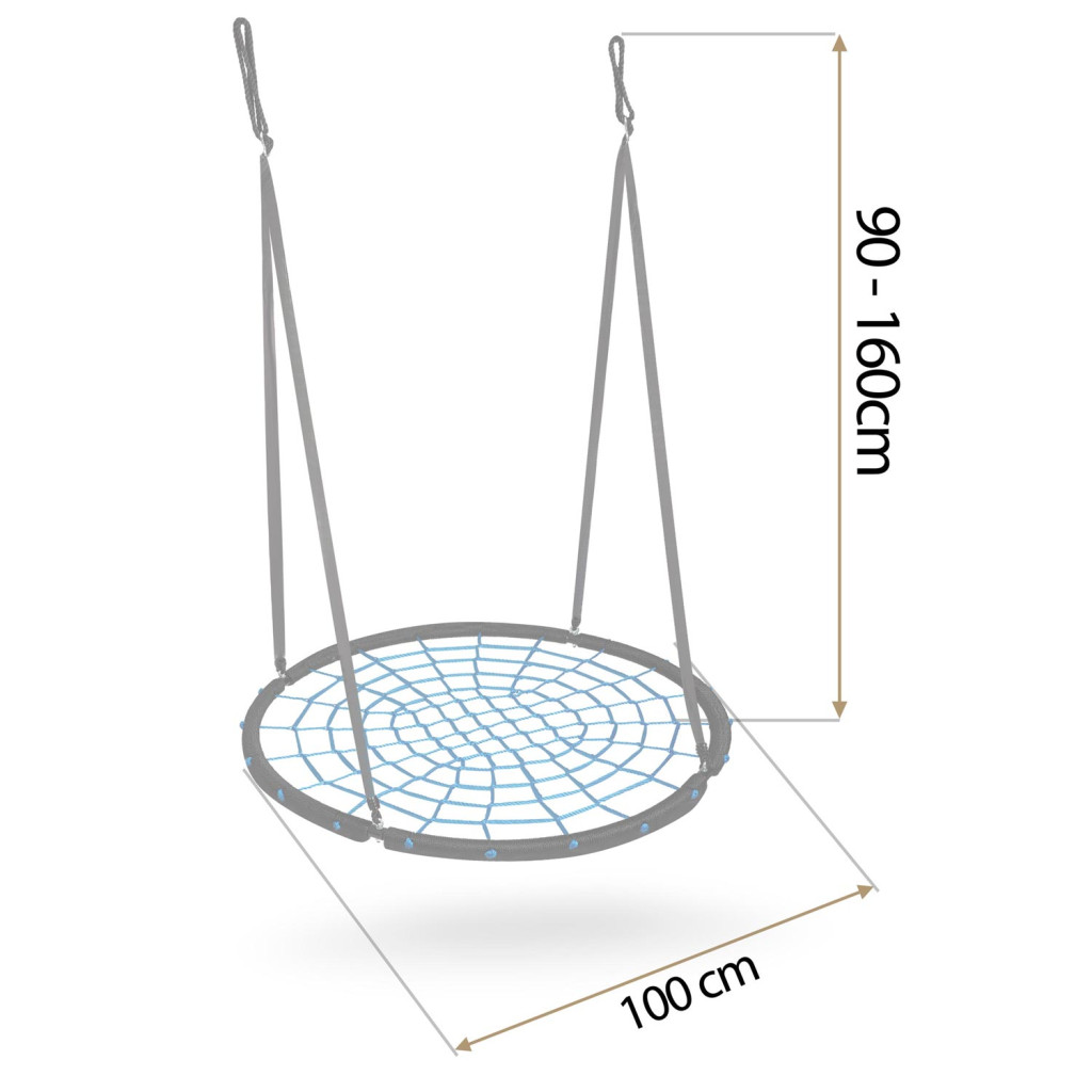 Varázsold a kertet igazi kalandparkká a Neo-Sport NS-104 fészekhintával! A 100 cm átmérőjű, masszív fekete fémgyűrűt kék-fekete kötélháló tölti ki, amely kényelmes alátámasztást nyújt egy vagy akár két gyermeknek is. A négy ponton rögzített, erős függesztőkötél stabil, biztonságos hintázást garantál, miközben a hinta mindössze 4,8 kg, így könnyedén áthelyezhető a kert különböző pontjaira.