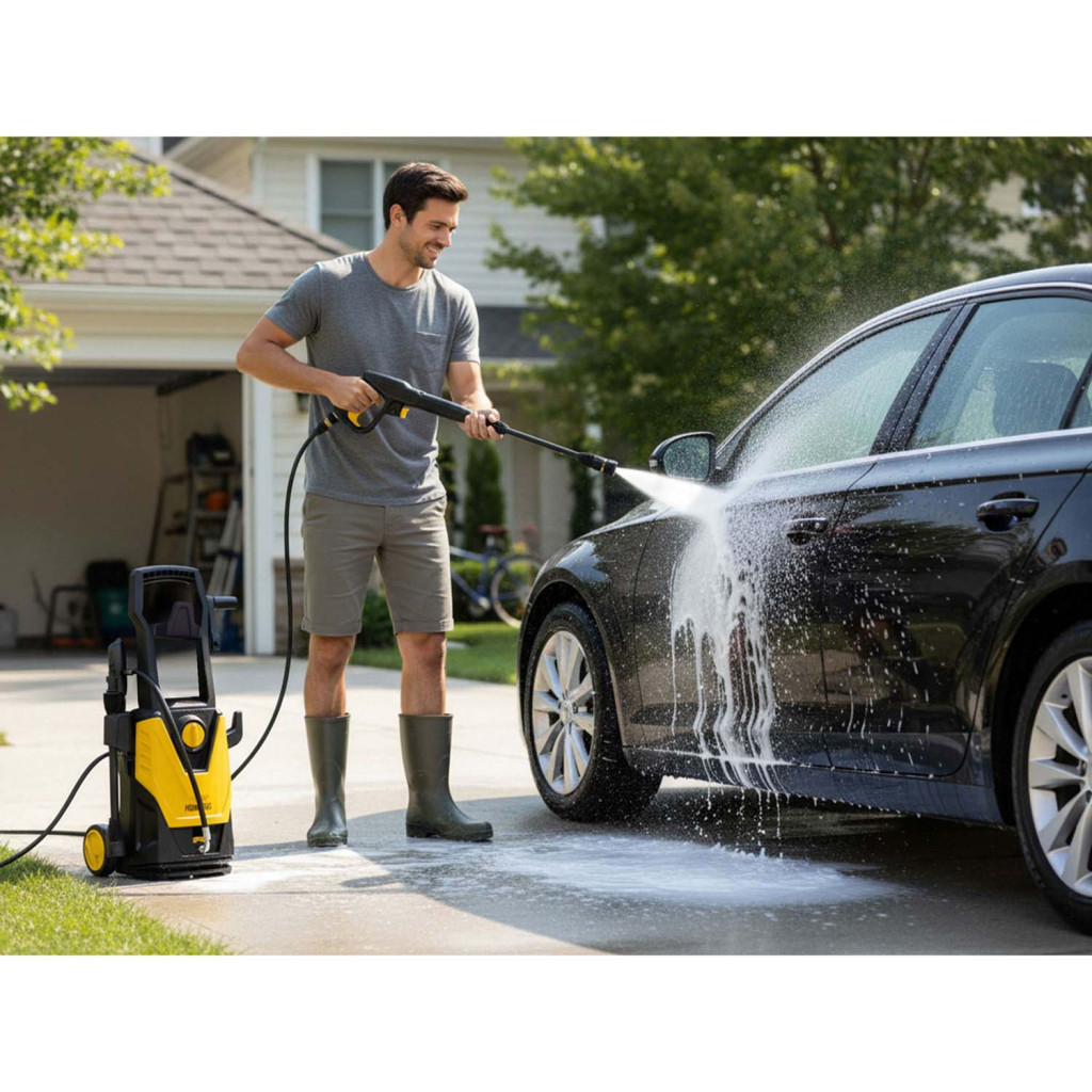 Az automatikus indítás-leállítás funkció víz- és áramtakarékosan működik, miközben a pisztolyon lévő biztonsági retesz megóv a véletlen elsütéstől. A gumírozott kerekekkel és a stabil talppal könnyedén guríthatod a készüléket a kertben, a beépített tartók pedig rendezetten tartják a tömlőt és a kábelt. A nagy teljesítmény ellenére a gép mindössze 6,7 kg, ezért lépcsőn vagy autó csomagtartójában is könnyű mozgatni.