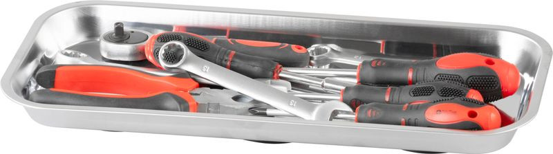 Az erős mágnes három ponton rögzíti a tálat, így stabilan kapaszkodik liftajtóra, emelőre vagy műhelyszekrény oldalára. A sima, csúszásmentes belső felület gyorsan lemosható, nem hagy rozsdafoltot, nem karcolja a kötőelemek fejét. Tágas 36 cm-es hossza lehetővé teszi többféle alkatrész szétválasztását, a magas perem pedig megakadályozza a kipottyanást még rázkódás közben is.