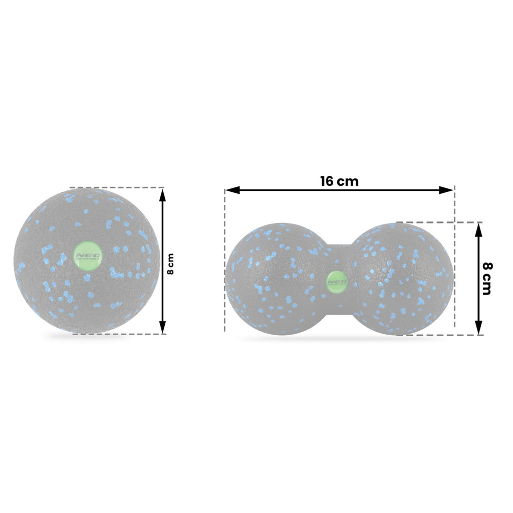 A Neo-Sport NS-997 masszázslabda készlet két részből áll: egy 8 cm átmérőjű gömbből és egy 16 cm hosszú, kettős kialakítású labdából. A mindössze 0,2 kg-os, strapabíró EPP habból készült eszközök ellenállnak a víznek és a deformációnak. A szemcsés felület pontos nyomást gyakorol az izmokra, így ideális bemelegítéshez, levezetéshez, rehabilitációhoz vagy otthoni lazításhoz. Kis mérete miatt sporttáskában, hátizsákban is könnyedén elfér. Használhatod talp, nyak, vádli vagy hát kezelésére, hogy felgyorsítsd a regenerációt és fokozd a mozgékonyságot.