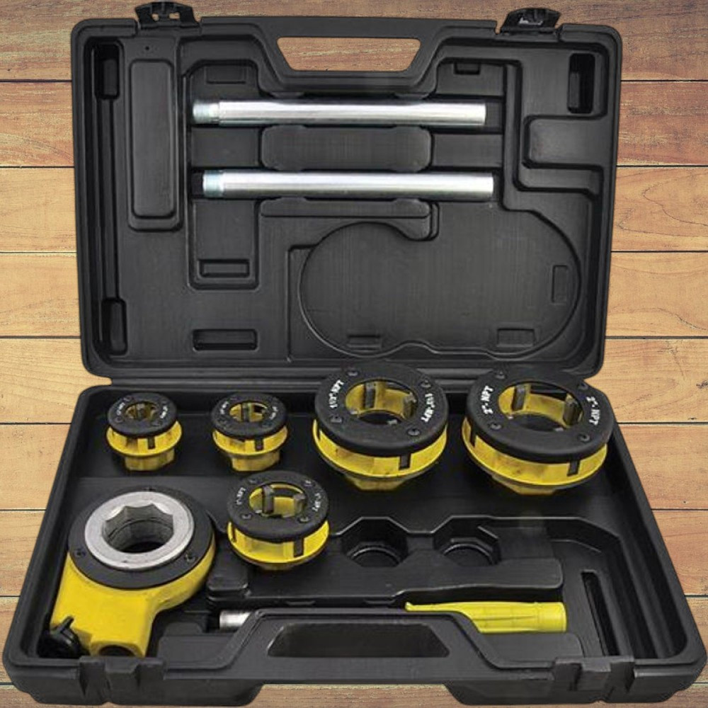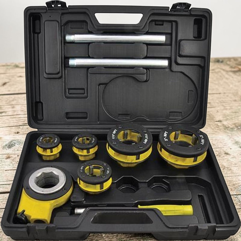 A Strend Pro RDS-8835 menetvágó készlet ideális társ, ha acél- vagy műanyagcsövekre szeretnél gyorsan, pontosan és egyenletesen külső menetet készíteni. Az öt cserélhető fej (1/2", 3/4", 1", 6/4", 2") lefedi a leggyakoribb víz- és gázcső méreteket, a racsnis hajtókar pedig megkönnyíti a folyamatos forgatást anélkül, hogy közben el kéne engedned a szerszámot. A hosszabbítható fogantyú növeli az erőkar hosszát, így kisebb erővel is tiszta, szabványos menetet vághatsz.