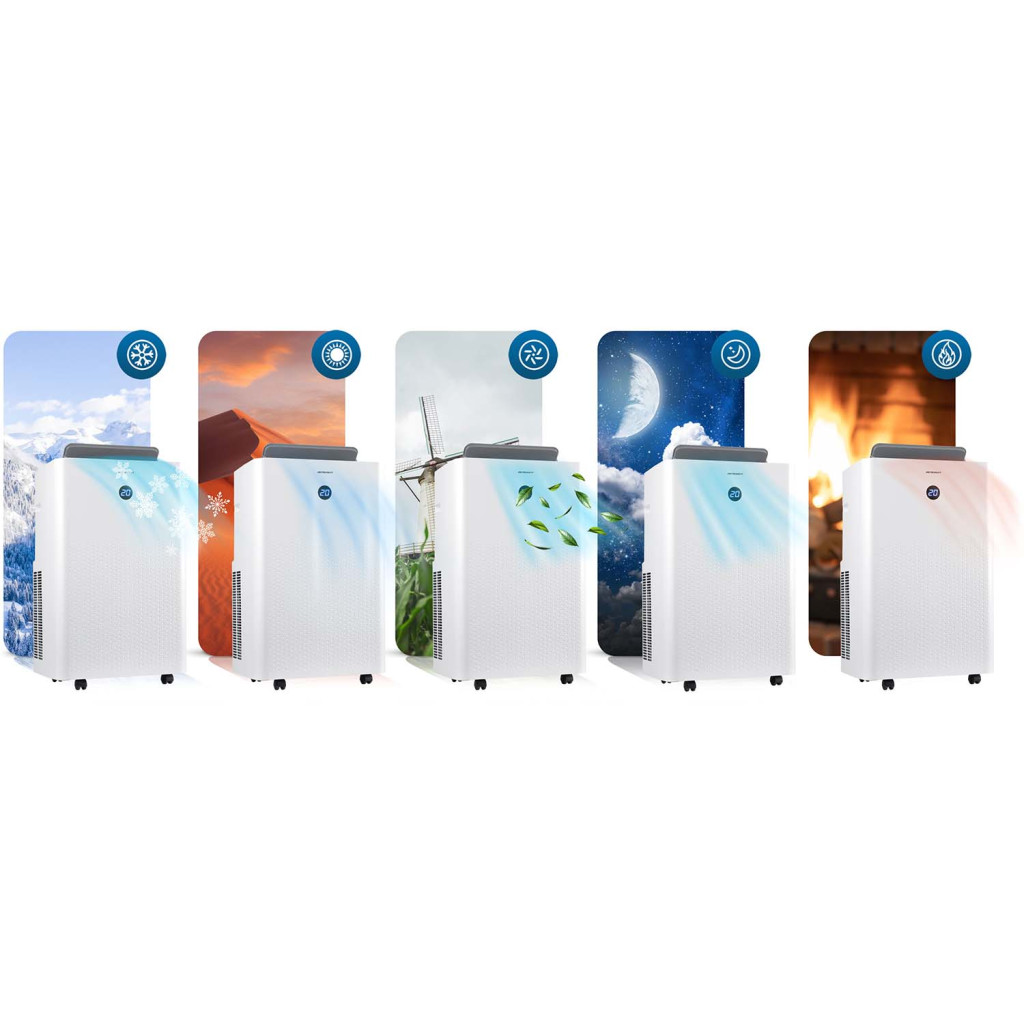Öt funkciót egyesít: hűt, fűt, szárít, ventilál, valamint alvó üzemmódra vált, így minden időben biztosítja a komfortot. Beépített Wi-Fi modulja révén okostelefonról bárhonnan szabályozhatod a hőfokot vagy az időzítőt. A környezetbarát R290 hűtőközeg óvja az ózont, a gyermekzár védi a beállításokat, az automatikus párologtatás pedig ritkítja a víztartály ürítésének szükségességét.