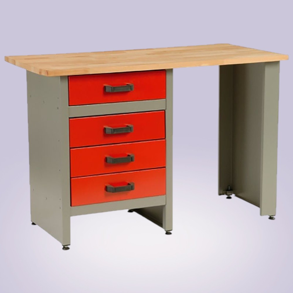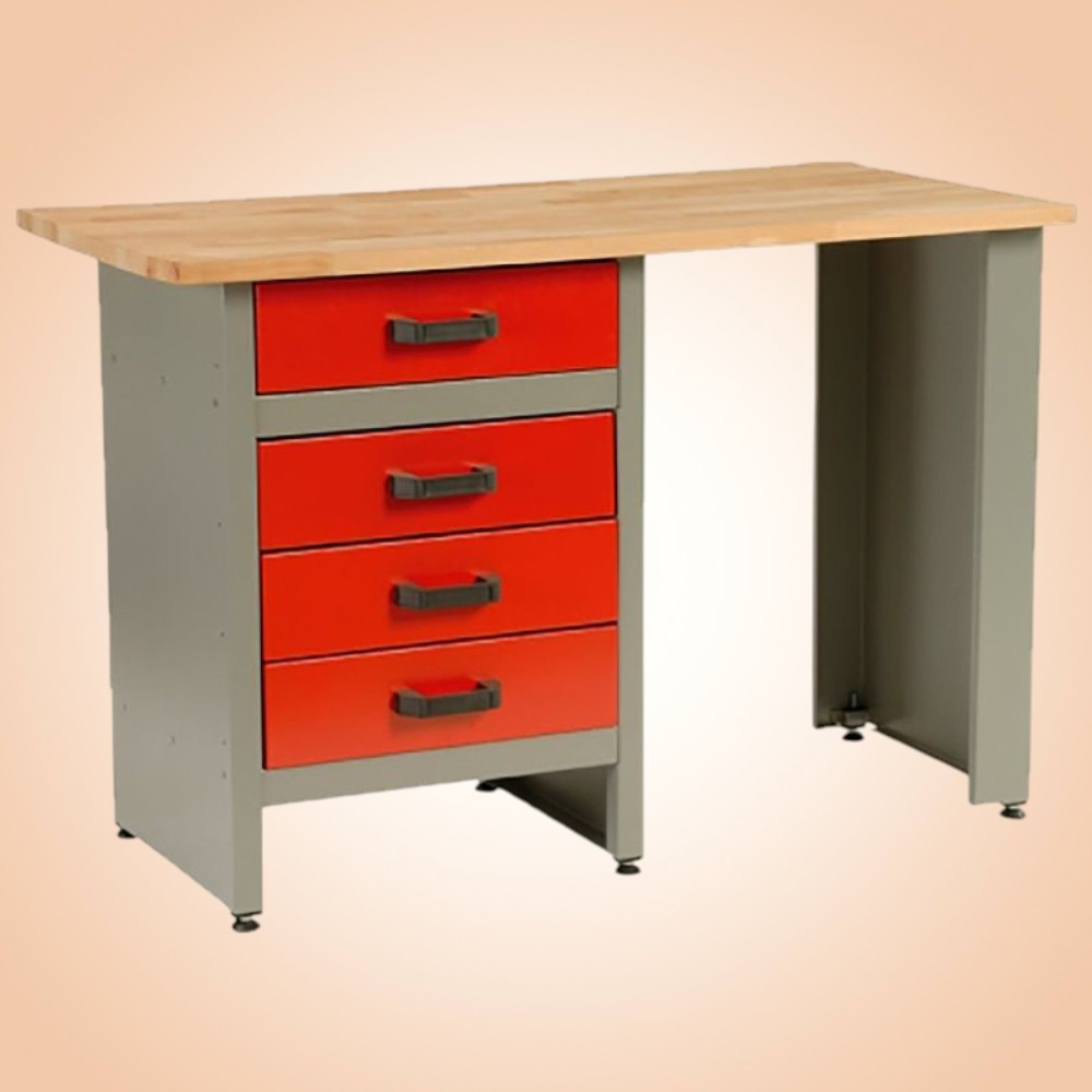 Az Asztal 4 Z masszív acéllemez váza és vastag fa munkafelülete megbízható alapot nyújt minden műhelymunkához. A 1215 × 615 × 800 mm-es méret bőséges helyet kínál, a négy, golyóscsapágyas síneken futó fiók pedig gyors és zavartalan hozzáférést biztosít a szerszámokhoz. A lábak állíthatók, így az asztal stabil marad egyenetlen padlón is, miközben 350 kg/m² statikus teherbírással állja a kihívásokat.