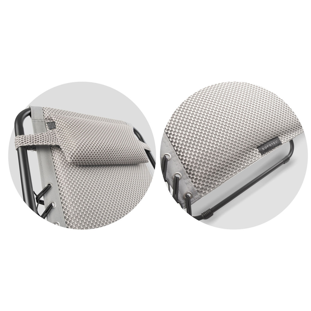 Élvezd a gondtalan kerti pihenést a Sofotel ChillWell Soft összecsukható nyugággyal! A mindössze 7,9 kilogrammos szerkezetet pillanatok alatt kinyithatod, majd lapra hajtva könnyedén elpakolhatod. A légáteresztő, méhsejtmintás szürke szövet hűs érzetet ad, az erős acélváz pedig stabil tartást biztosít tetőtől talpig. A levehető fejpárna gyengéden támasztja a nyakat, így órákig élvezheted a napfényt vagy a csillagokat maximális kényelemben.
