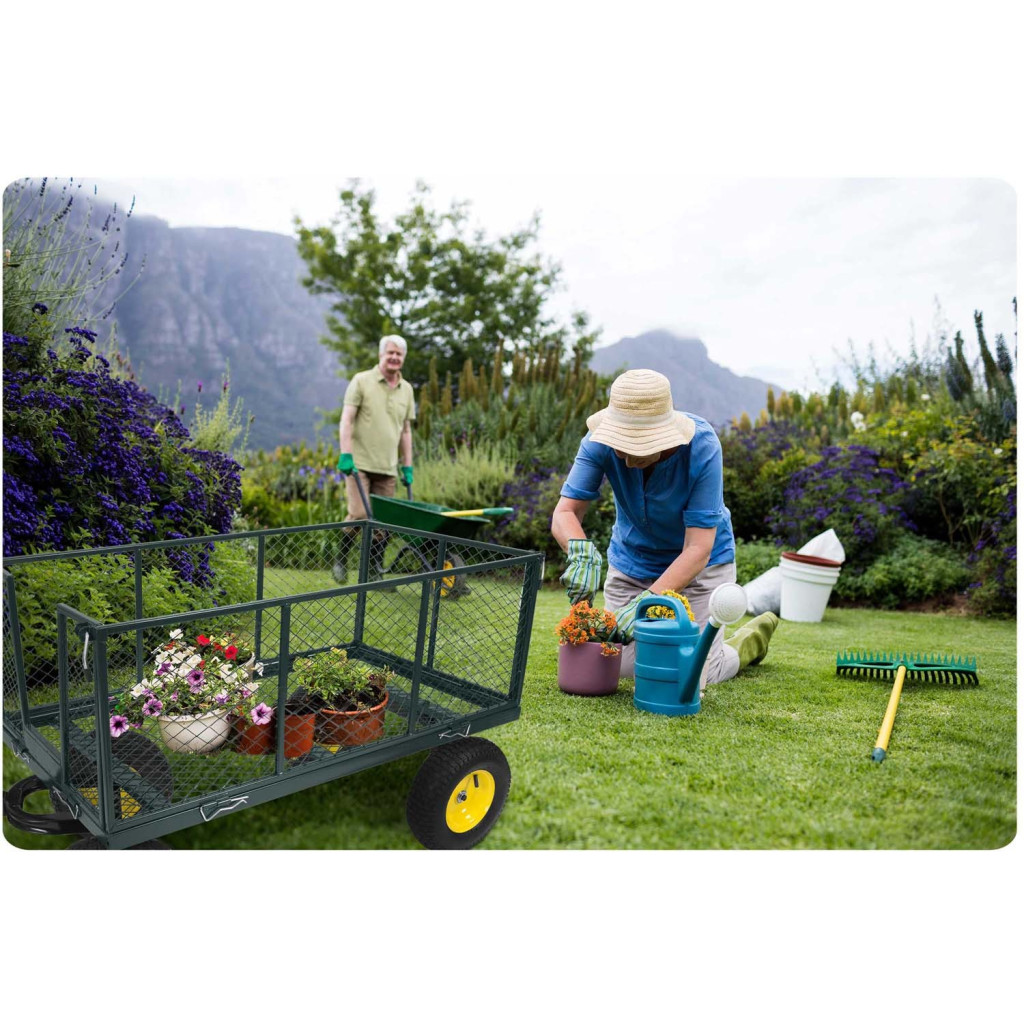 A deréktámaszt kímélő húzórúd miatt nem kell nehéz talicskát emelgetned, elég könnyedén húzni. Lehajtható oldalai révén pillanatok alatt platóvá alakítható, így akár facsemeték, hosszú lécek vagy zsákos termék is elfér rajta. Billenthető kialakítása gyors ürítést tesz lehetővé, időt és energiát spórolva. A porszórt acélváz ellenáll az időjárásnak, a vastag ponyvabetét pedig megvédi a rakteret a finom aprítéktól és a sártól.