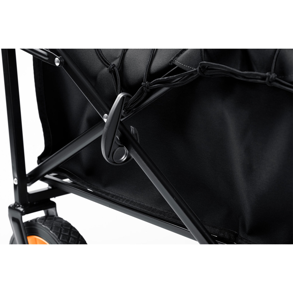 Nagybevásárlás, strandolás vagy kerti munka? A Humberg HM-513 összecsukható négykerekű strandkocsi minden alkalommal leveszi a terhet a válladról. Tágas, 100 literes rakodótere akár 90 kg felszerelést is elnyel, mégis csupán 9 kg a saját súlya, így emelni sem fáradság. Porszórt acél váza a fekete, vízlepergető PVC szövettel strapabíró párost alkot, a narancs kerekek pedig jól láthatóak egy zsúfolt parkolóban is. Az első kerekek teljes körben fordulnak, ezért a kocsi könnyedén veszi a hajtűkanyarokat, az állítható, ergonomikus fogantyú pedig kényelmesen kíméli a csuklót. Egy mozdulat, és lapra csukva máris befér a csomagtartóba vagy a kamra polcára.