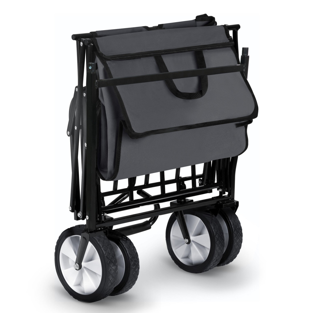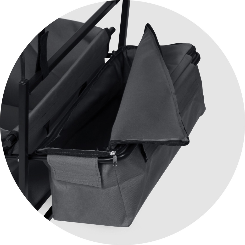 Ha eleged van a cipekedésből, ez a kocsi leveszi a terhet a válladról. A kormányozható első kerekek pontos irányítást adnak, a puha, csúszásmentes fogantyú pedig kíméli a kezed hosszabb távon is. A levehető, cipzáras oldaltáskába elrejtheted az apró holmikat, így nem keverednek a nagyobb tárgyak közé. A tetőt igény szerint magasíthatod vagy egy mozdulattal leemelheted, a gyors összecsukó rendszerrel pedig pillanatok alatt betolhatod az autó csomagtartójába. Kert, piac, strand – bárhol helytáll.