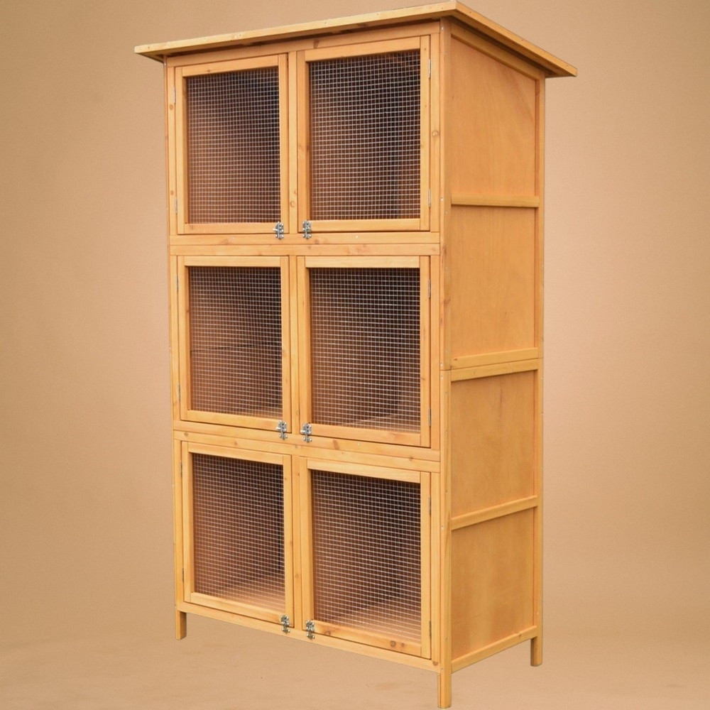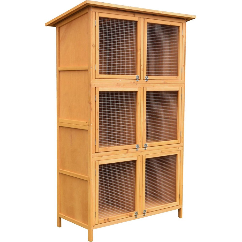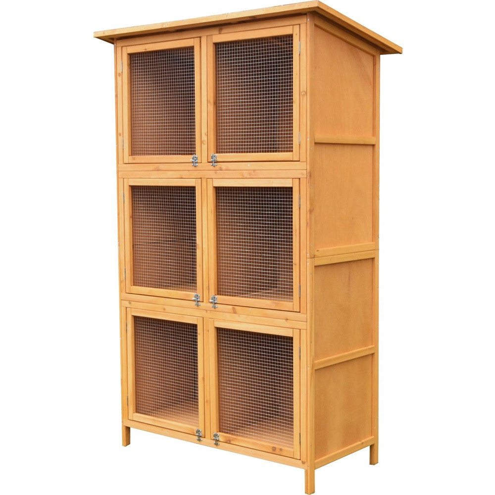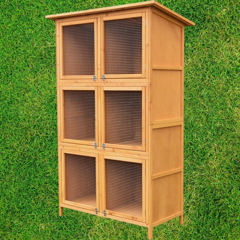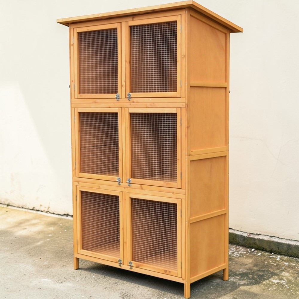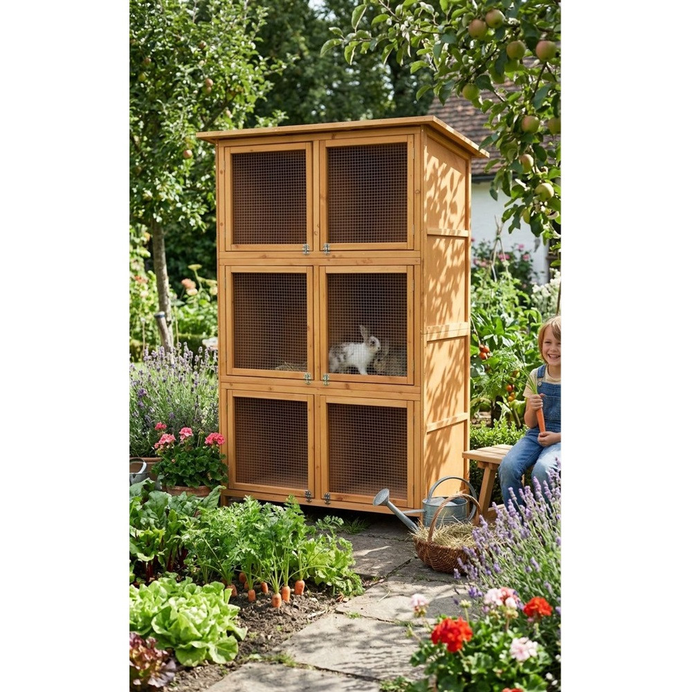 Ez a több szintes, tetővel ellátott ketrec biztonságos, jól szellőző és könnyen hozzáférhető életteret biztosít a nyulaknak. A magas kialakítás kis alapterületen is elegendő mozgásteret ad, a fa-fém kombináció pedig időjárásálló stabilitást nyújt kültéri tartás esetén is. A különálló boxok segítik a rendszerezést, így egyszerre több állatot is kényelmesen elhelyezhetsz.
