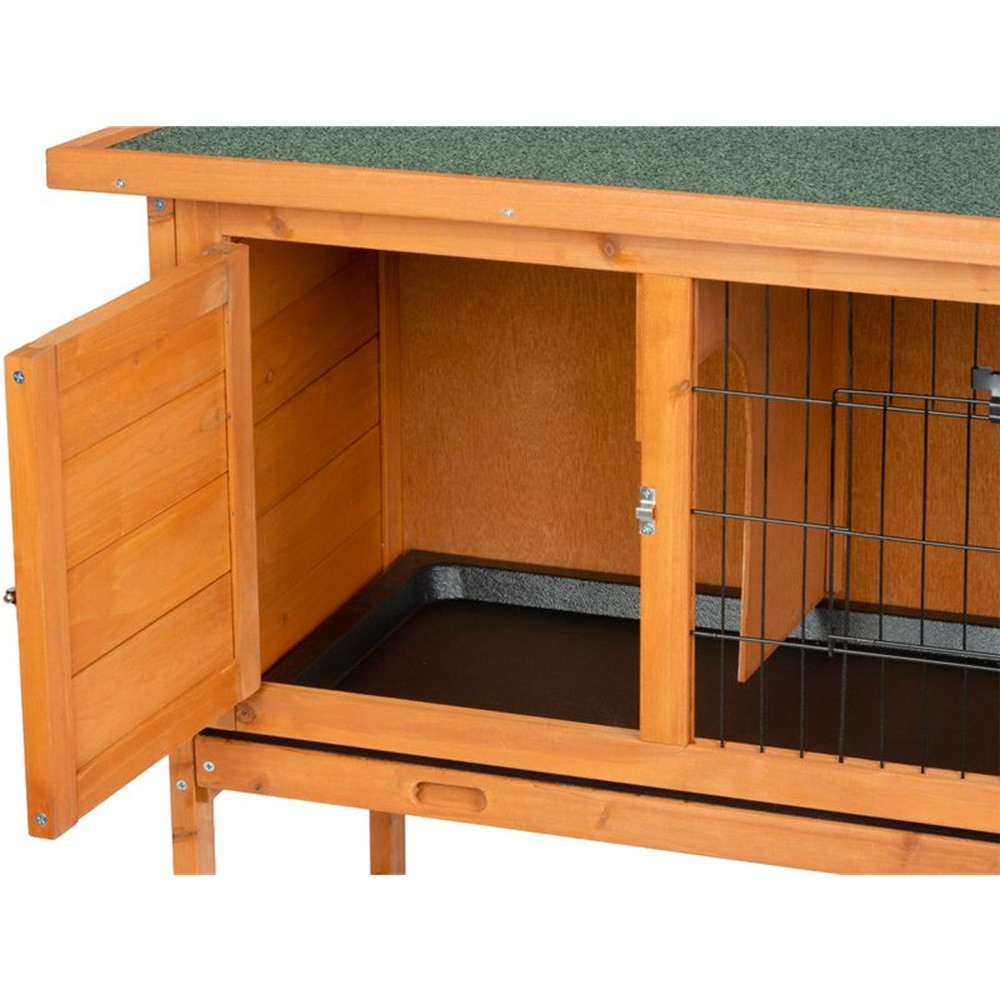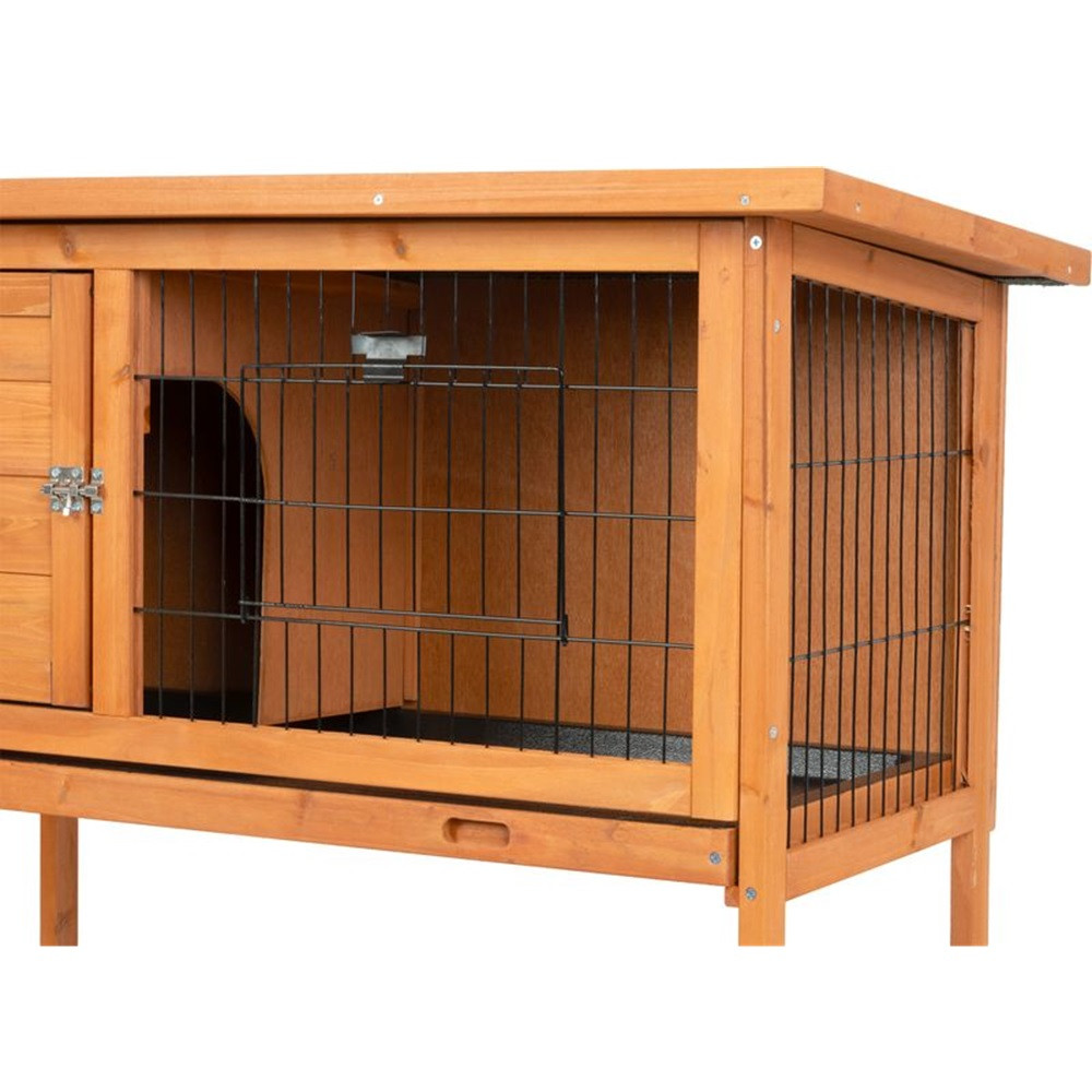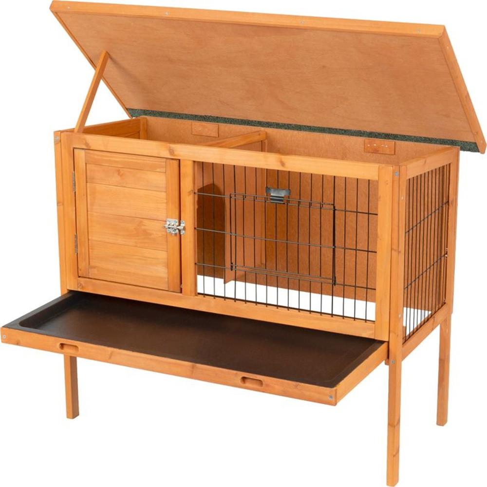 A Nyúlketrec Strend Pro tetővel (91,5 × 45 × 70 cm) kényelmes és biztonságos otthont teremt nyuladnak vagy más kisebb rágcsálónak. Az emelt, stabil lábak távol tartják a talaj nedvességét, és megkönnyítik a mindennapi gondozást. A ketrec két részből áll: zárt, fából készült kuckó a nyugodt elvonuláshoz, illetve jól szellőző drótháló a friss levegőért és a játékért. A felnyitható tető, valamint a kihúzható tisztítófiók gyors hozzáférést és egyszerű higiéniai karbantartást tesz lehetővé.