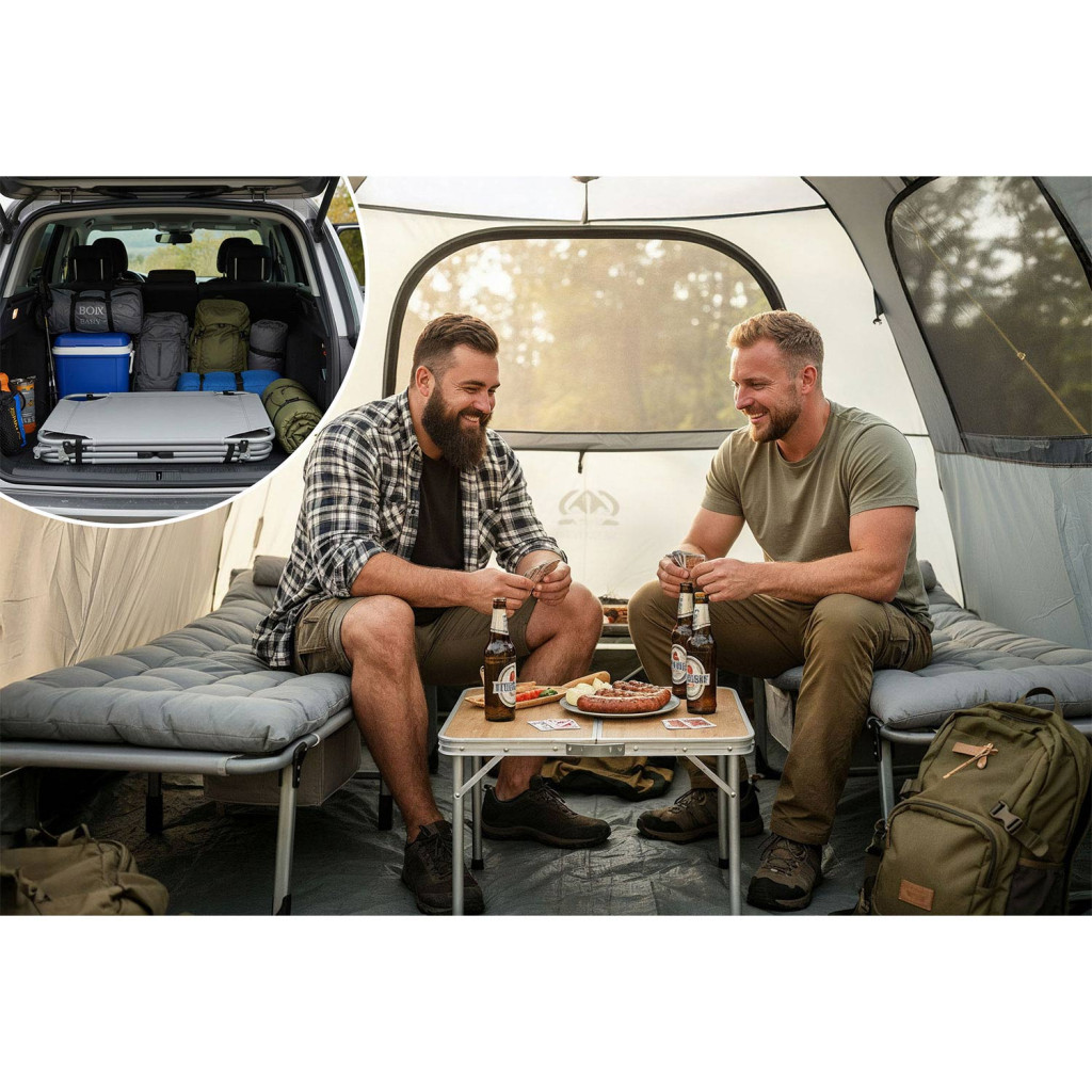 Ez a sokoldalú pihenőbútor nappali napozóként, délutáni olvasófotelként és éjszakai vendégágyként is megállja a helyét. A puha fejpárna kíméli a nyakat, a praktikus oldalzsebben pedig elfér a telefon, könyv vagy üdítő. A mellékelt hordtáska vállra akasztható, így szabadon maradnak a kezeid a piknikfelszereléshez. A szürke árnyalat elegánsan illeszkedik bármely kerthez, erkélyhez vagy sátorhoz, miközben a levehető matrac gyors szellőzést és egyszerű tisztítást biztosít.