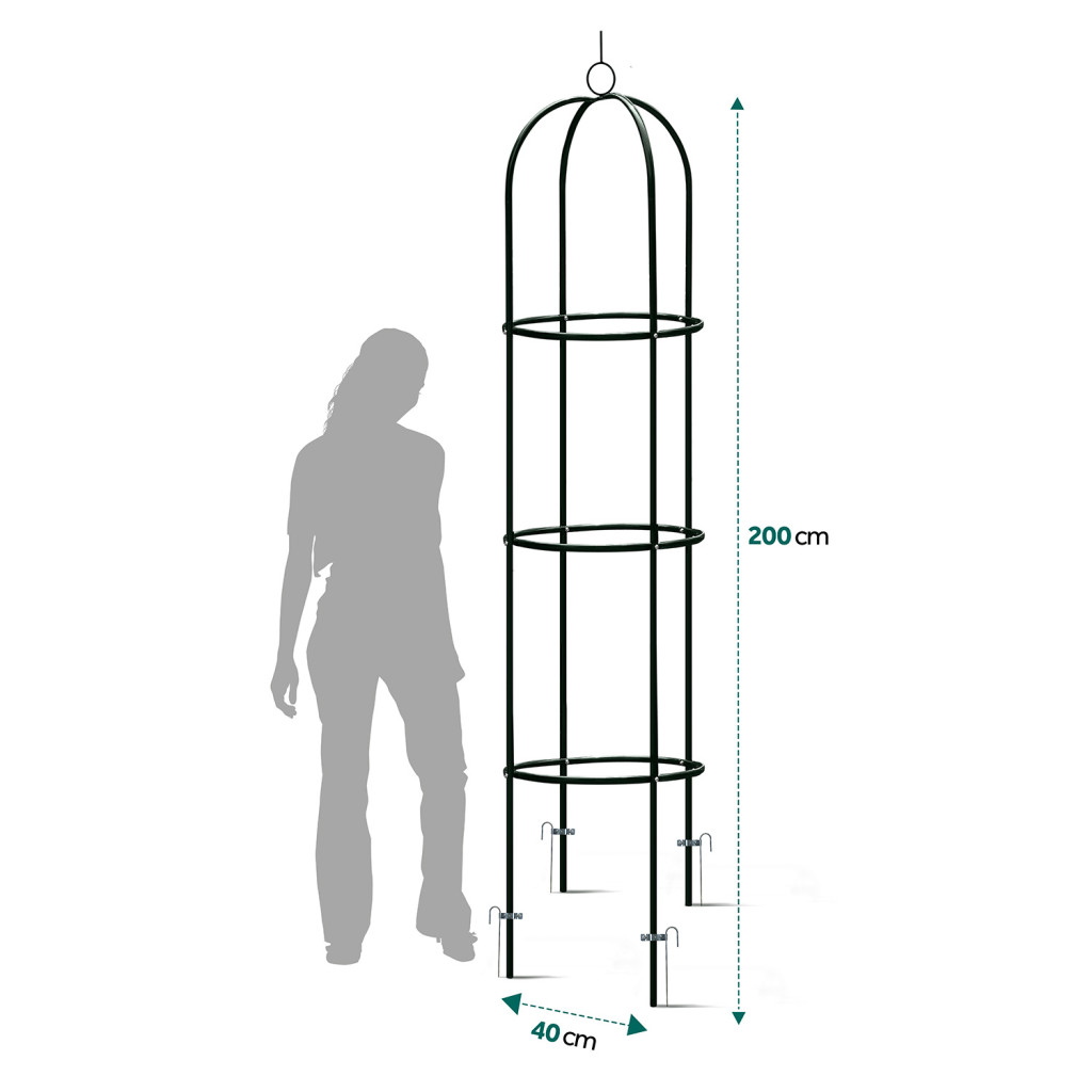 A Plonos PL-992 lugas 200 cm magas, karcsú oszlopformájával elegáns fókuszpontot teremt bármely kertben. Porszórt fekete acélcsövei időtálló védelmet nyújtanak az eső, a napsugárzás és a korrózió ellen, miközben erős tartást biztosítanak a rózsák, futóloncok vagy szőlővesszők számára. A 40 × 40 cm-es alapterület kis helyigényt jelent, mégis bőven hagy teret a dús növényzetnek. Négy talajrögzítő horgony óvja a szerkezetet a szélrohamoktól, így nyugodtan élvezheted a természet ihlette kompozíciót egész szezonban.